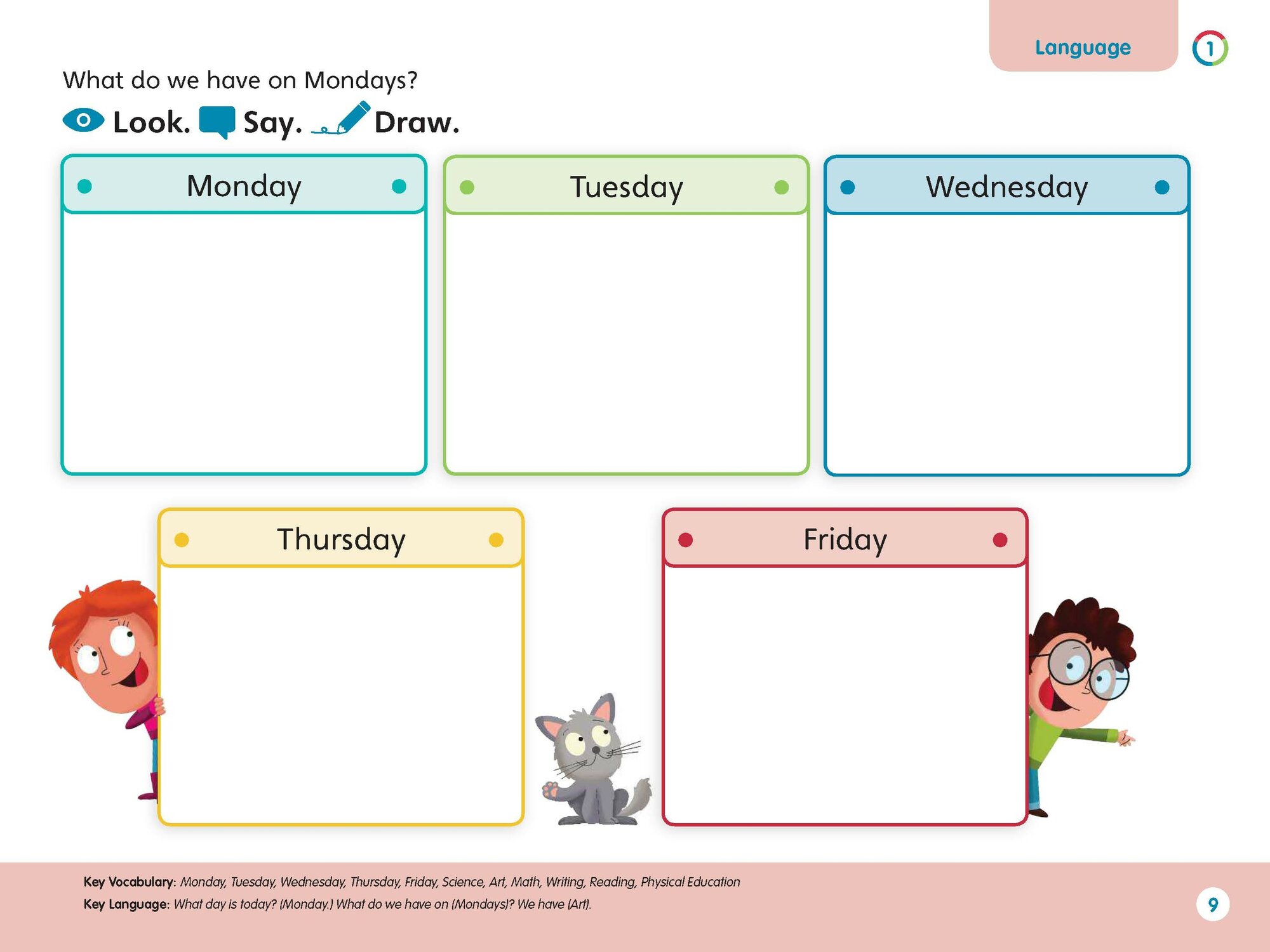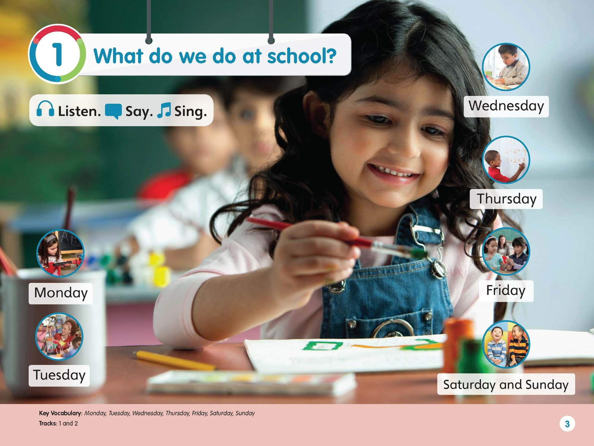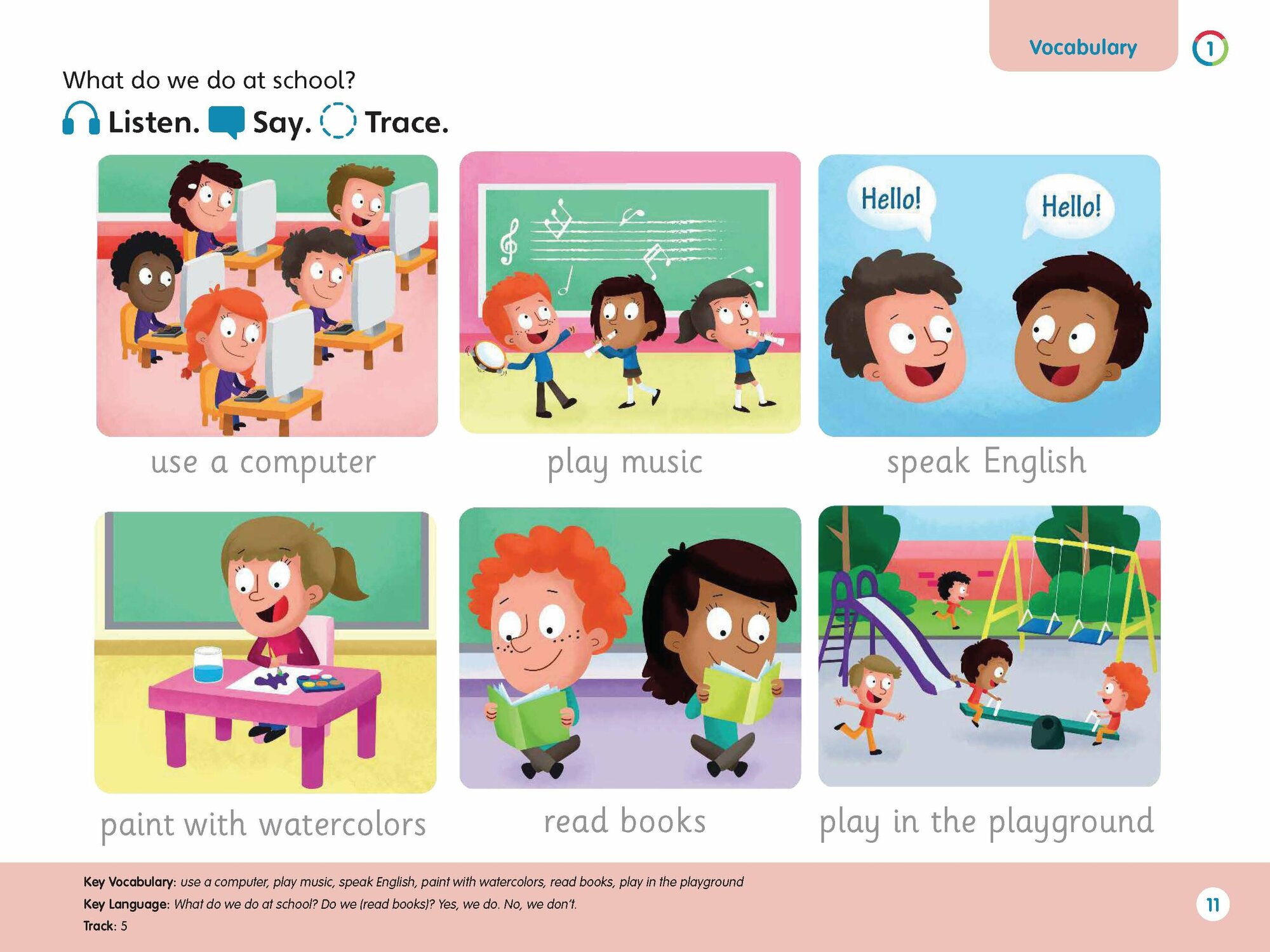 - Предварительные и начальные уроки грамотности, по два урока словарного запаса на раздел и урок счета;