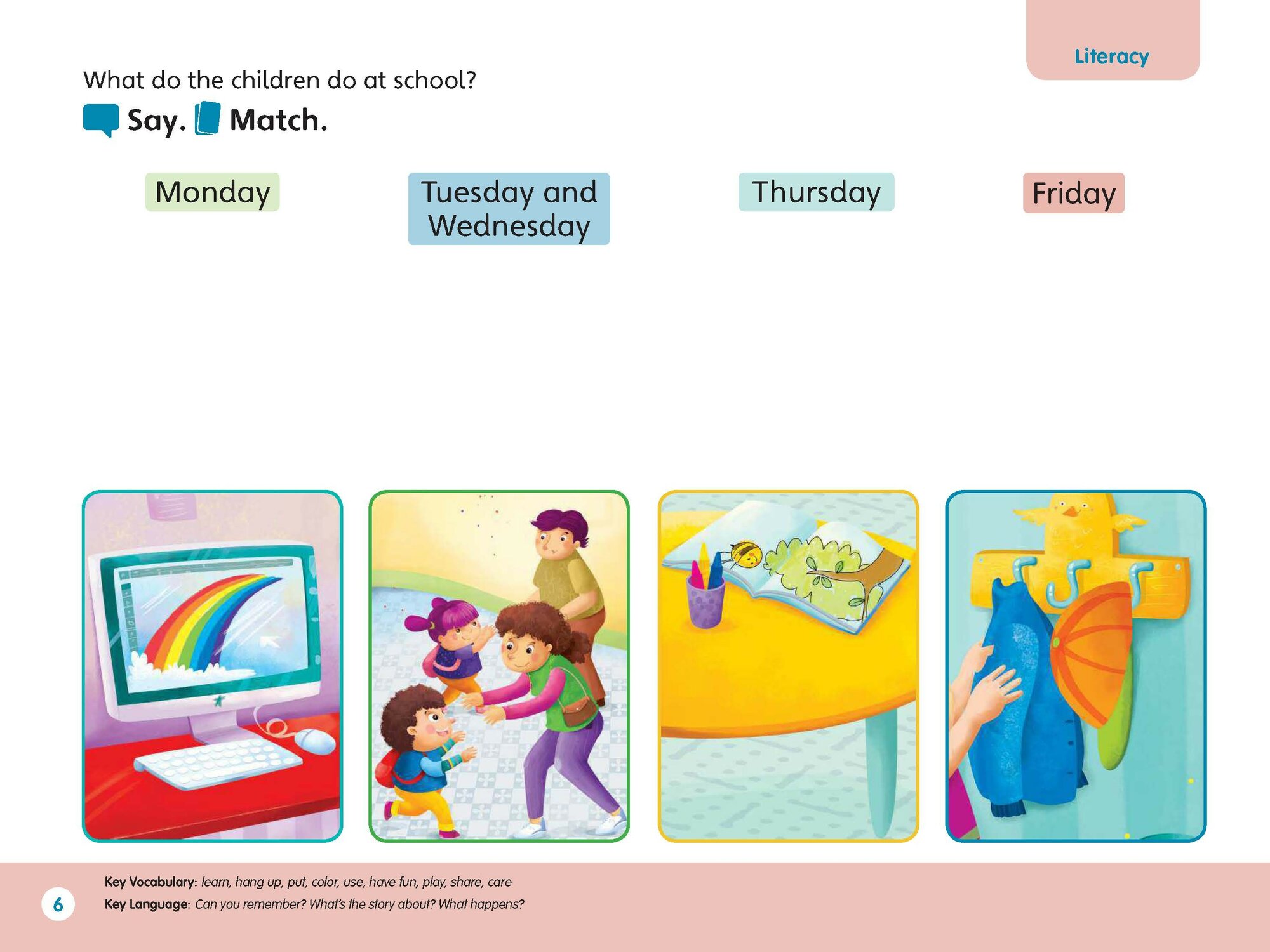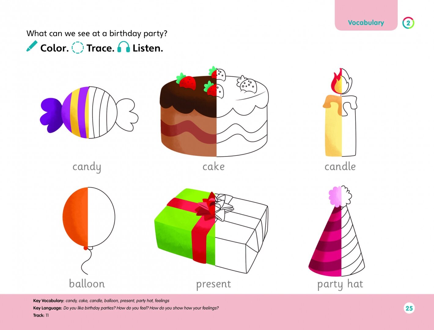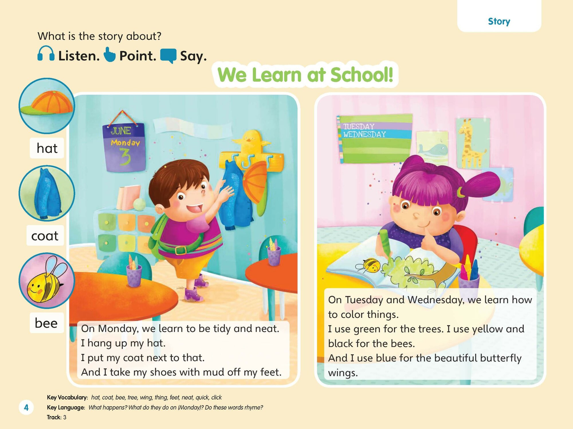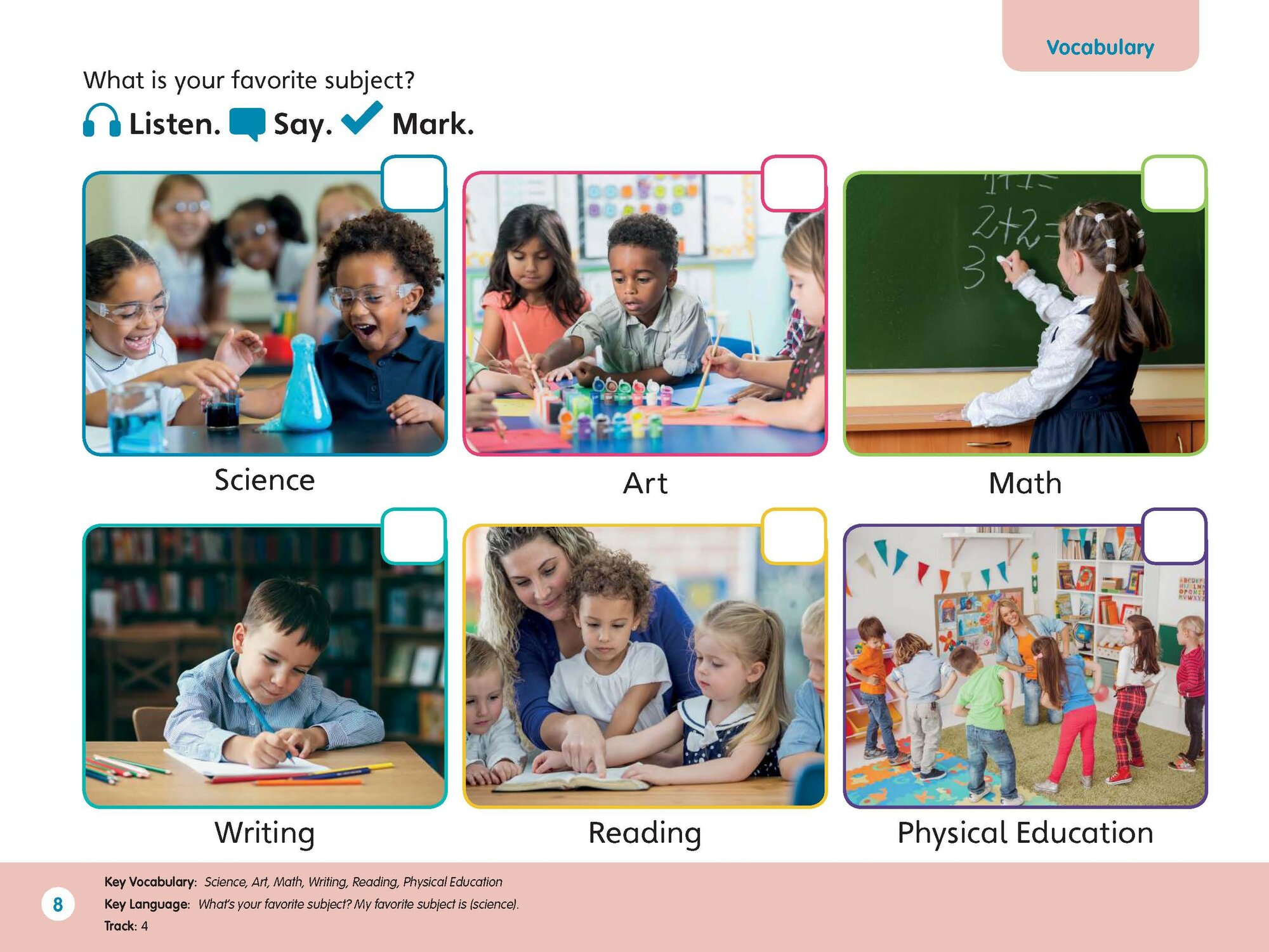 - Предварительные и начальные уроки грамотности, по два урока словарного запаса на раздел и урок счета;