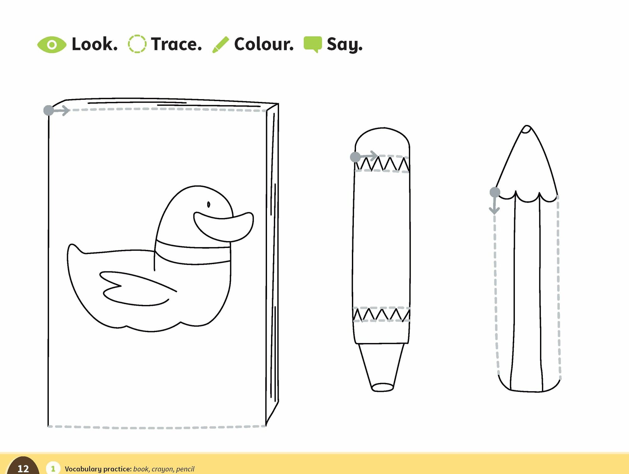 В рабочей тетради происходит большая часть практики работы с ручкой и бумагой. На каждую страницу учебника приходится по одной странице с различными упражнениями, направленными на развитие навыков обучения, например, страницы для самооценки. В конце пособия есть наклейки для выполнения некоторых заданий.