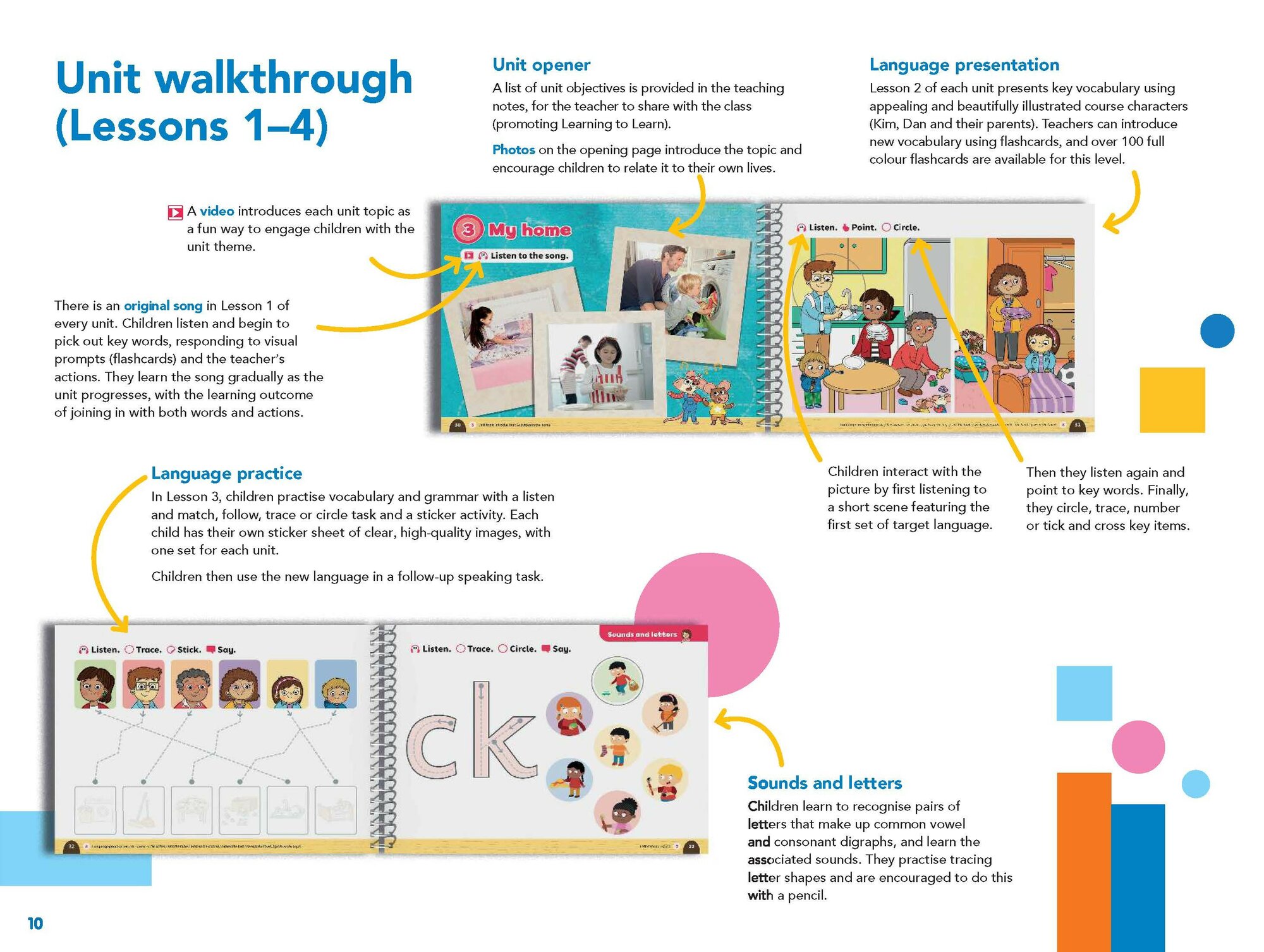 Книга для учителя представляет собой удобное руководство по обучению детей в рамках курса. Пособие содержит учебные заметки для каждого этапа урока и о том, как использовать различные компоненты курса; банк игр с использованием карточек и интерактивных игр в Presentation Plus; советы по развитию грамотности; поддержку оценки; руководство по развитию жизненных навыков.