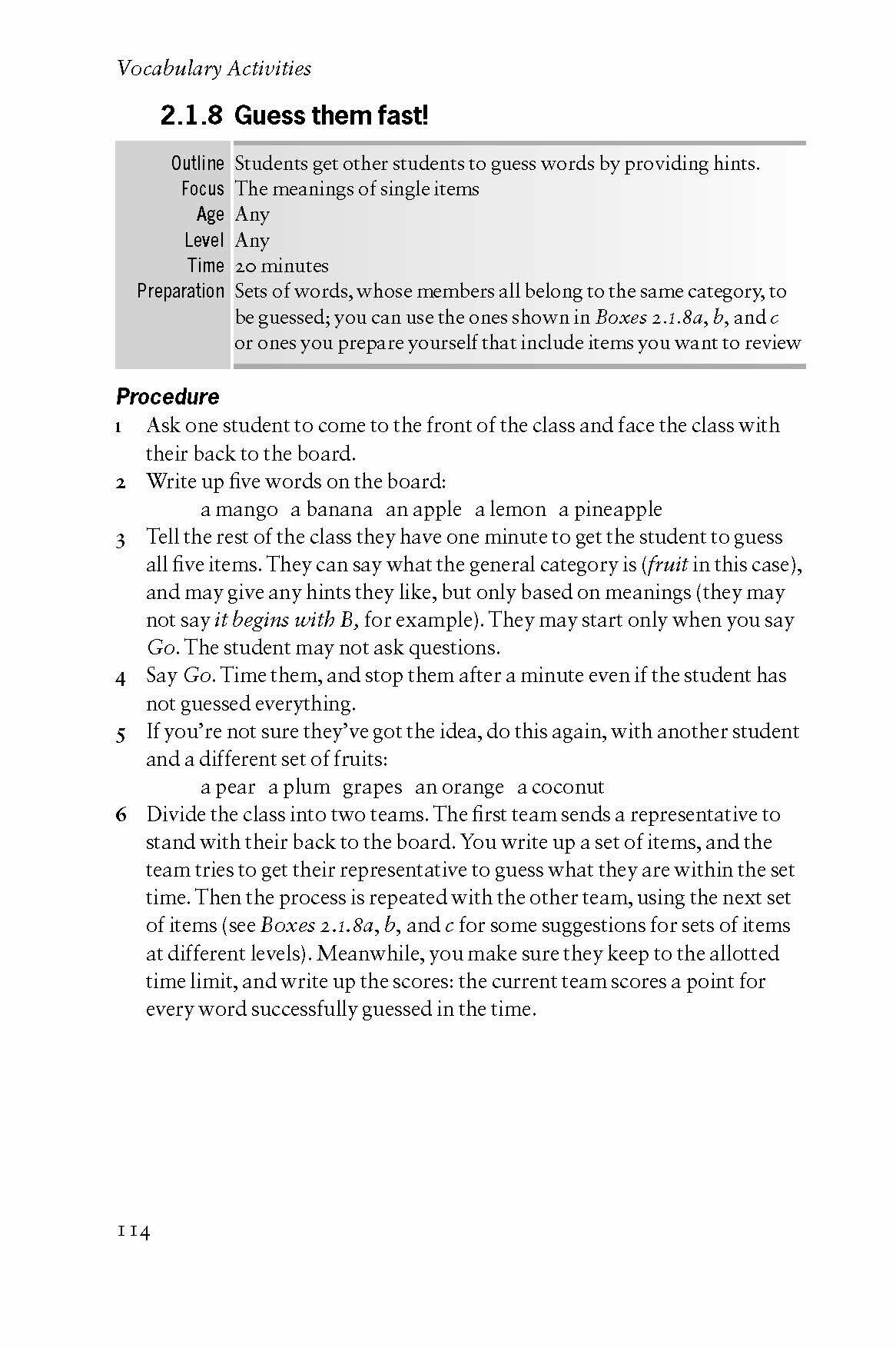 Vocabulary Activities provides a wealth of ideas for introducing, presenting, expanding, exploring and practising vocabulary. These teacher-friendly activities are clearly written and wide-ranging, and the book also contains a detailed guidelines section outlining the key principles involved in teaching and practising vocabulary. Also contains an extra chapter of activities for advanced learners.