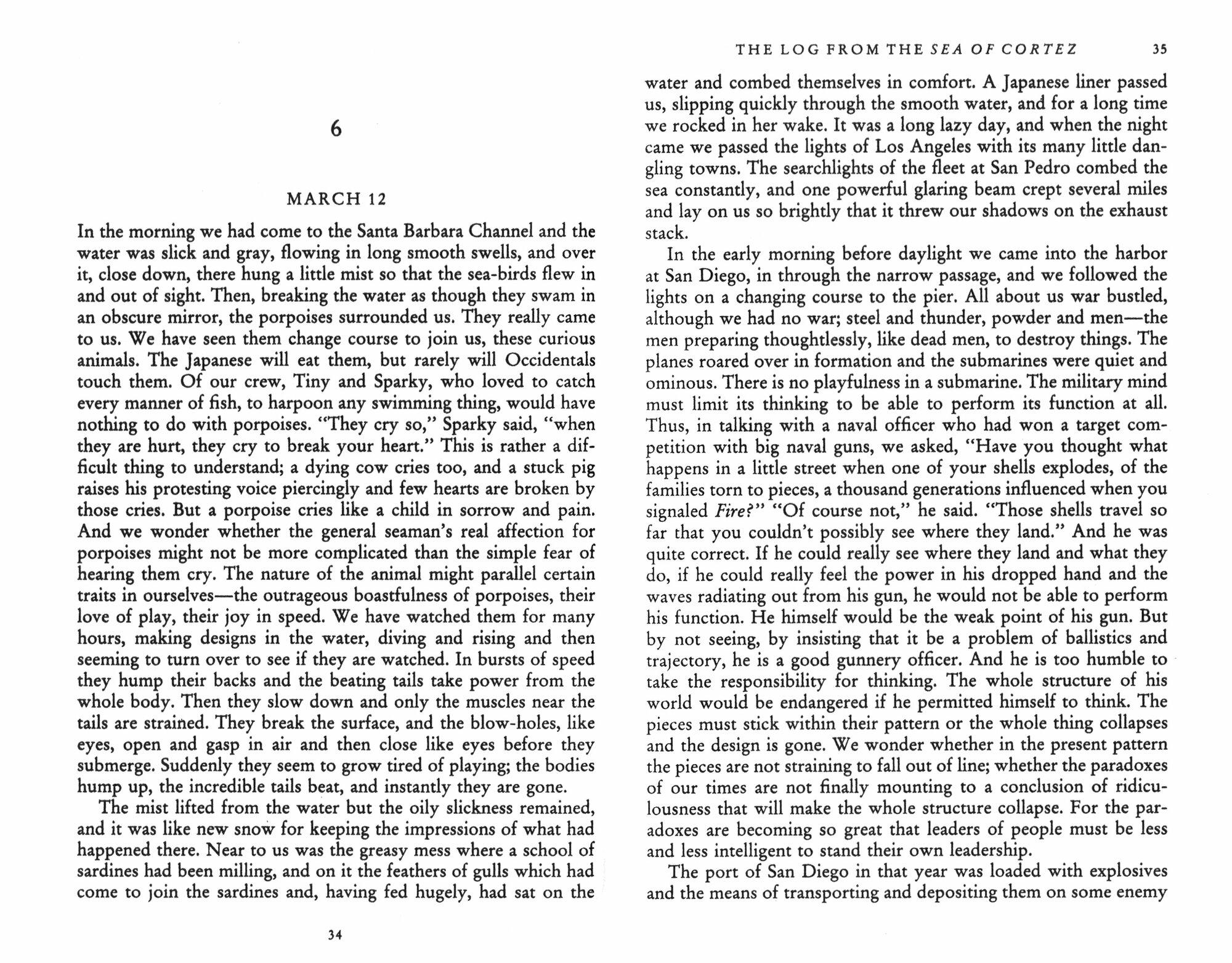 In 1940 Steinbeck sailed in a sardine boat with his great friend the marine biologist, Ed Ricketts, to collect marine invertebrates from the beaches of the Gulf of California. The expedition was described by the two men in Sea of Cortez, published in 1941. The day-to-day story of the trip is told here in the Log, which combines science, philosophy and high-spirited adventure.