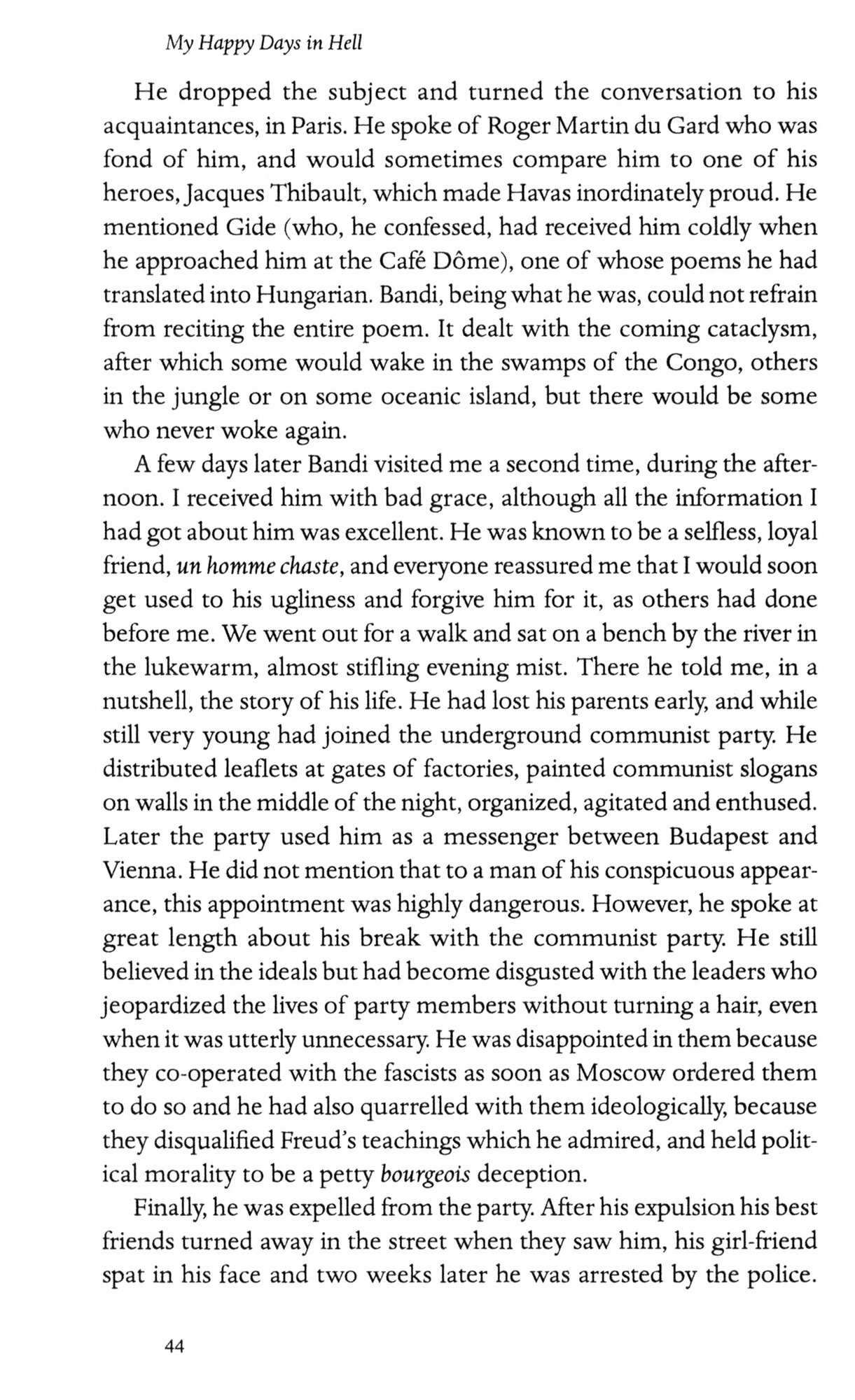 My Happy Days in Hell (1962) is Gyorgy Faludy's grimly beautiful autobiography of his battle to survive tyranny and oppression. Fleeing Hungary in 1938 as the German army approaches, acclaimed poet Faludy journeys to Paris, where he finds a lover but merely a cursory asylum. When the French capitulate to the Nazis, Faludy travels to North Africa, then on to America, where he volunteers for military service. Missing his homeland and determined to do the right thing, he returns - only to be imprisoned, tortured, and slowly starved, eventually becoming one of only twenty-one survivors of his camp.