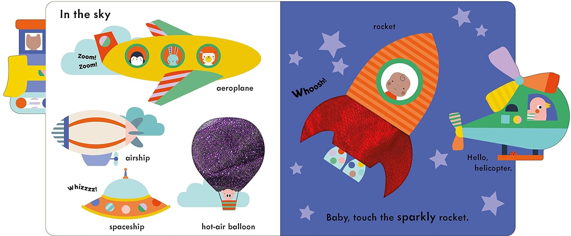 There are also big, stimulating touch-and-feel areas to stroke and talk about on every page - which wheel feels bumpy? Which window feels shiny?