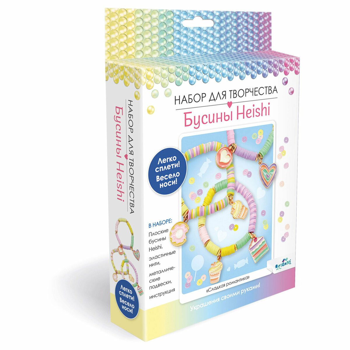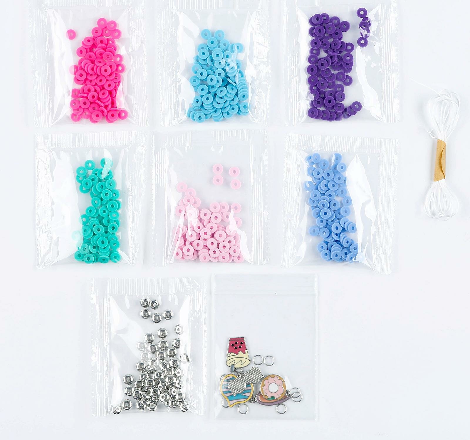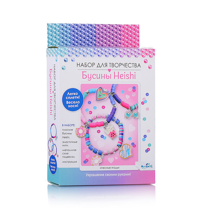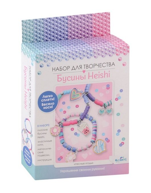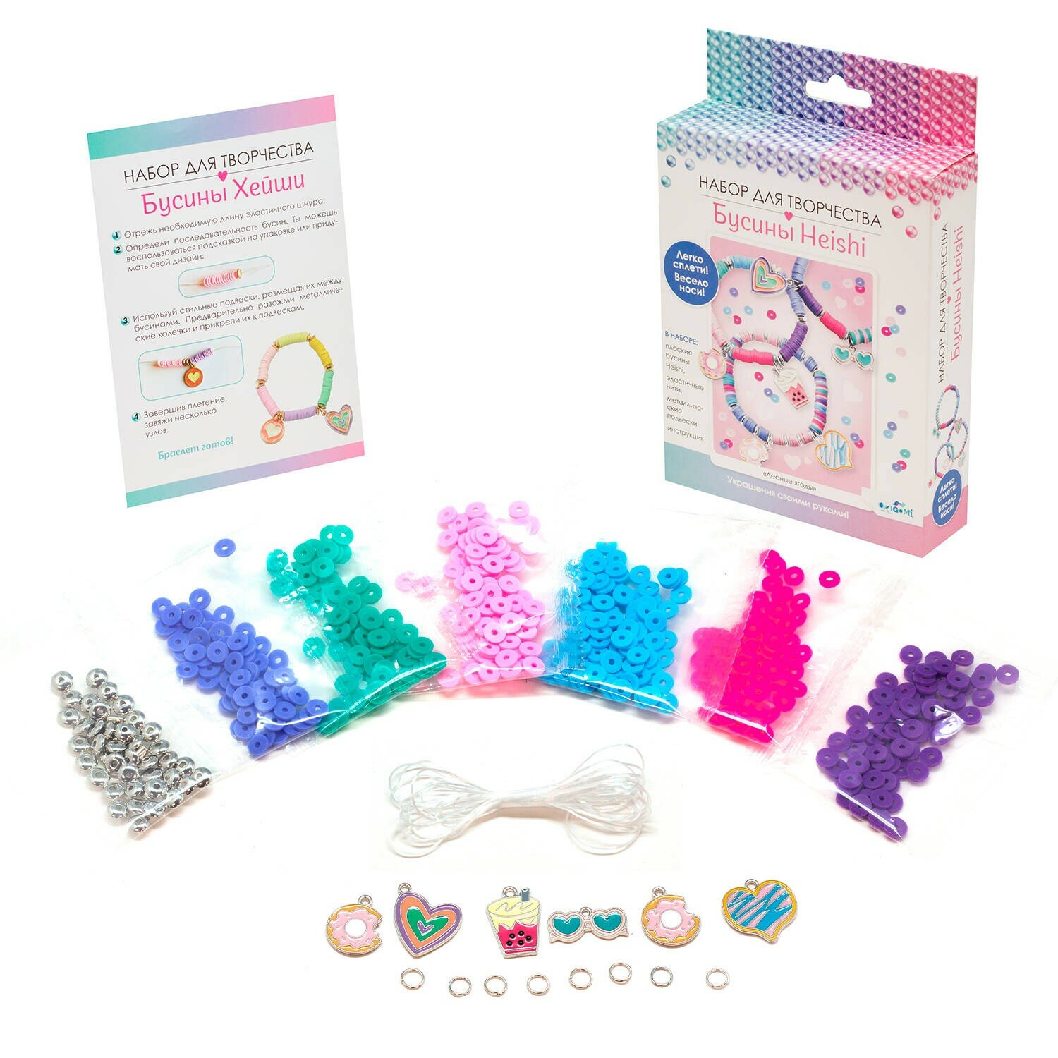В наборе: плоские бусины Heishi, эластичные нити, металлические подвески, инструкция.