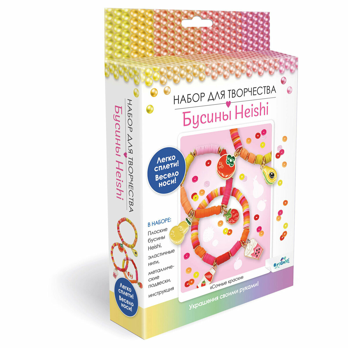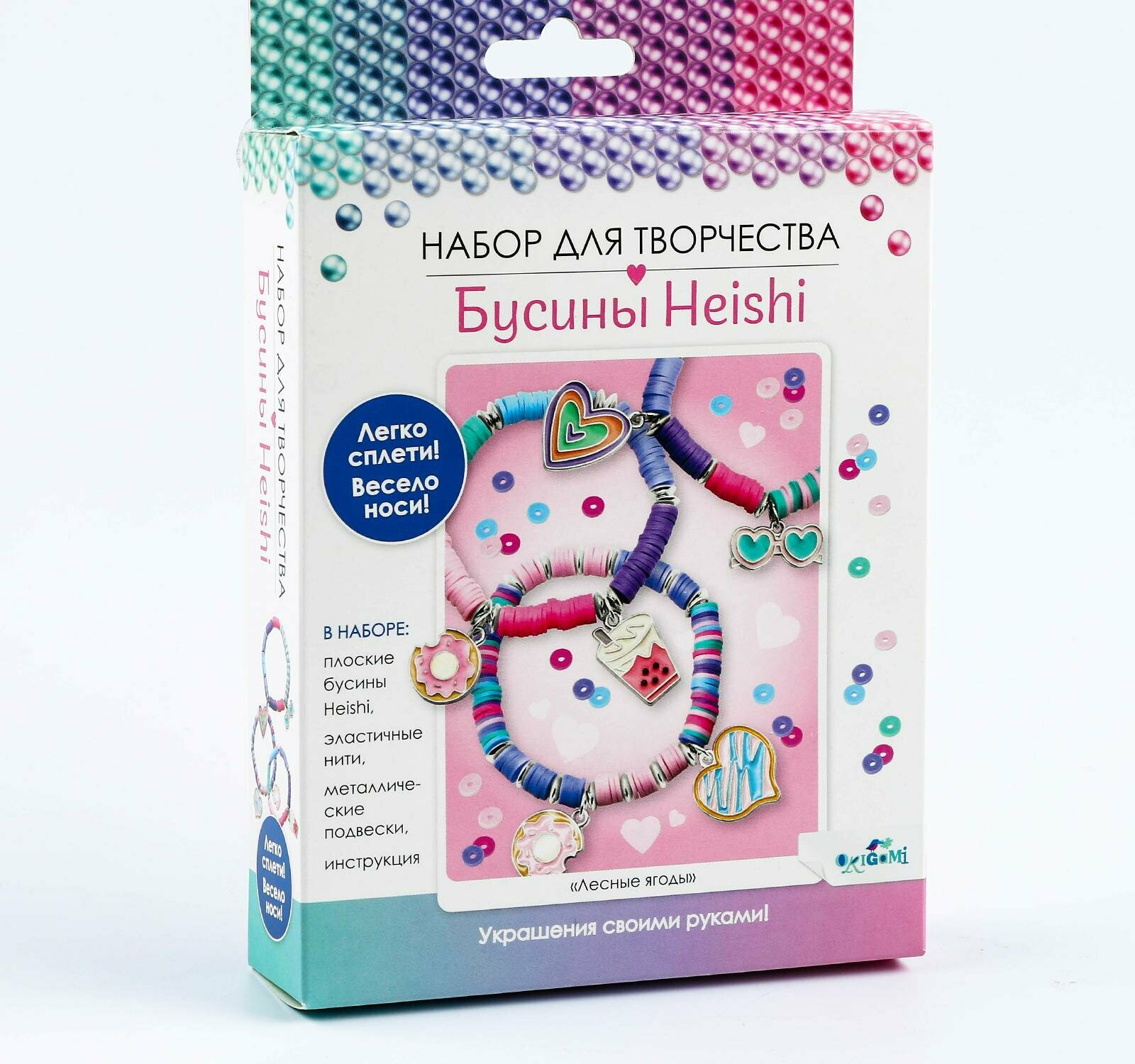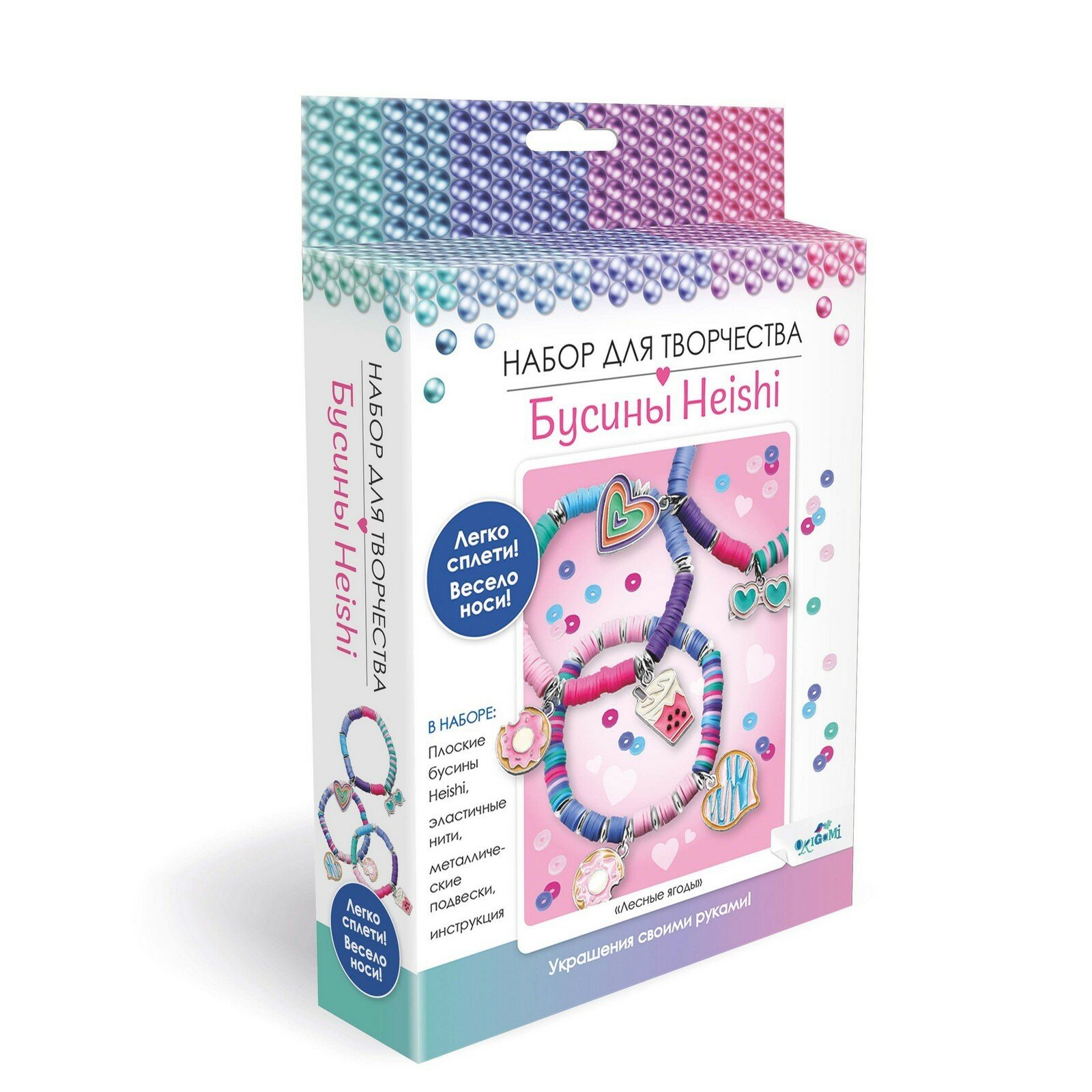 В наборе: плоские бусины Heishi, эластичные нити, металлические подвески, инструкция.
