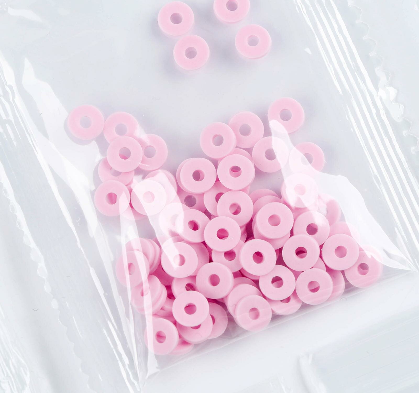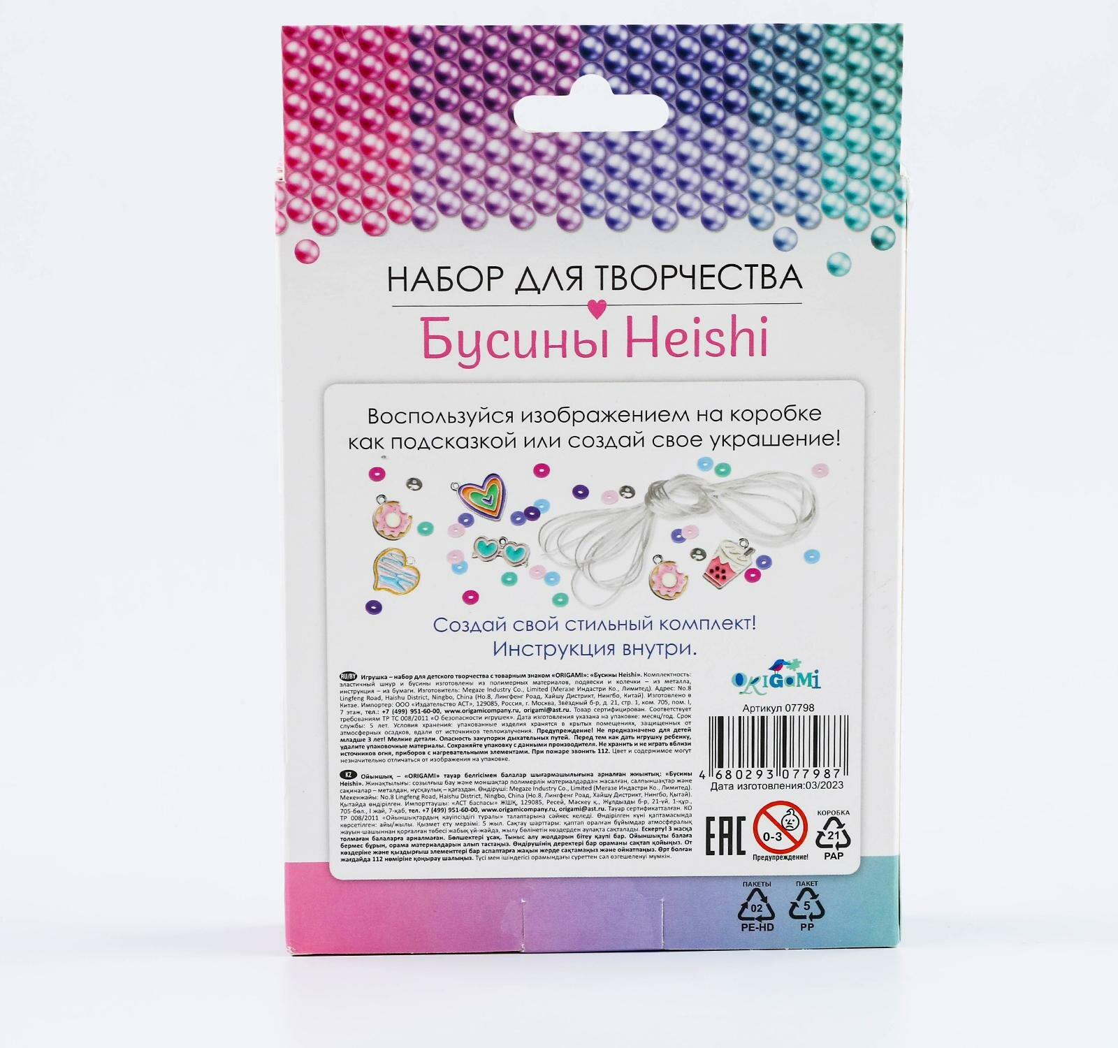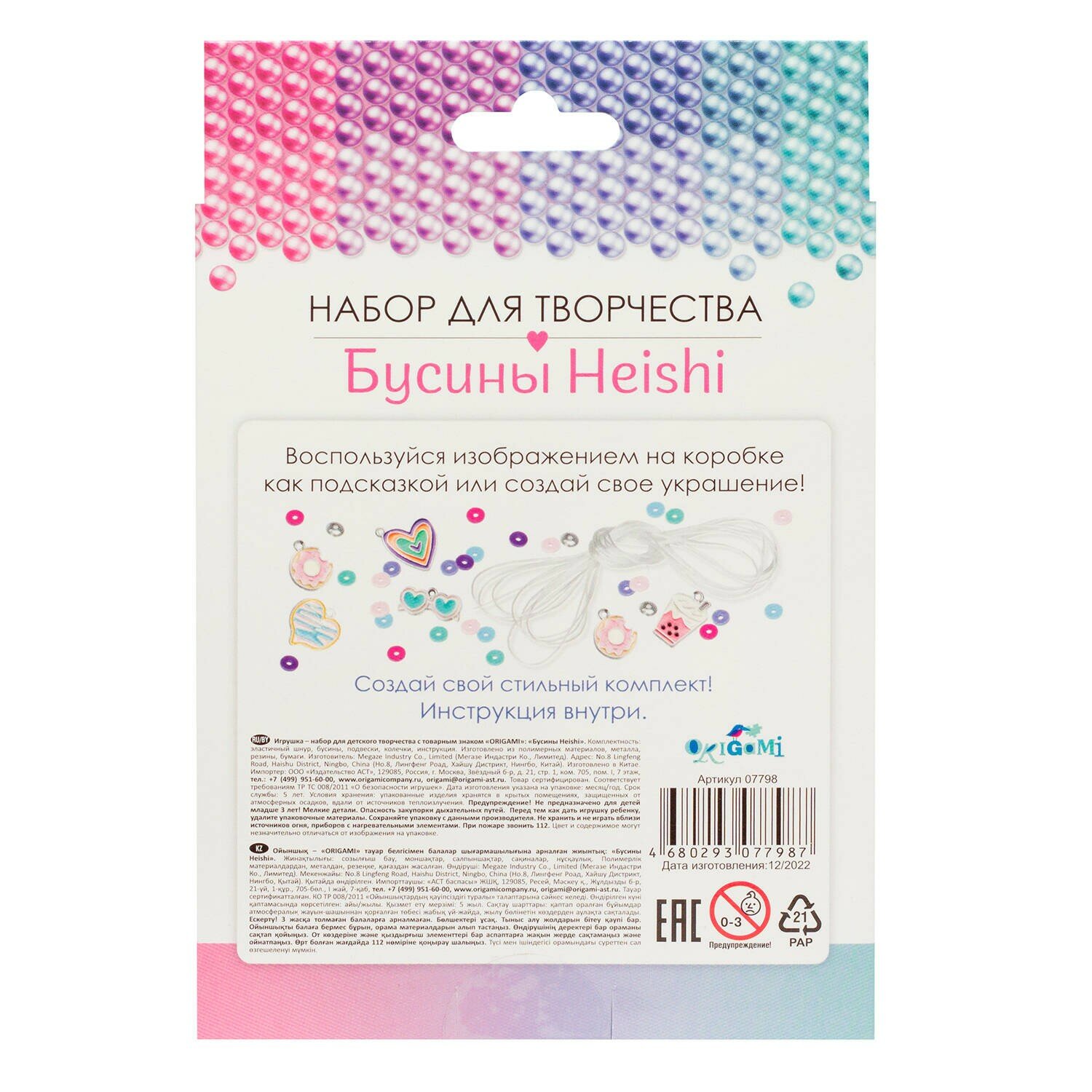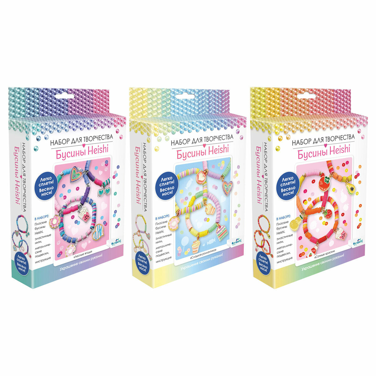 В наборе: плоские бусины Heishi, эластичные нити, металлические подвески, инструкция.
