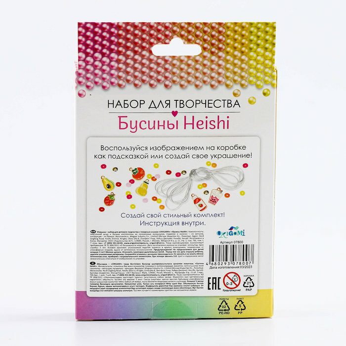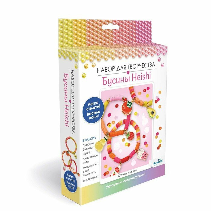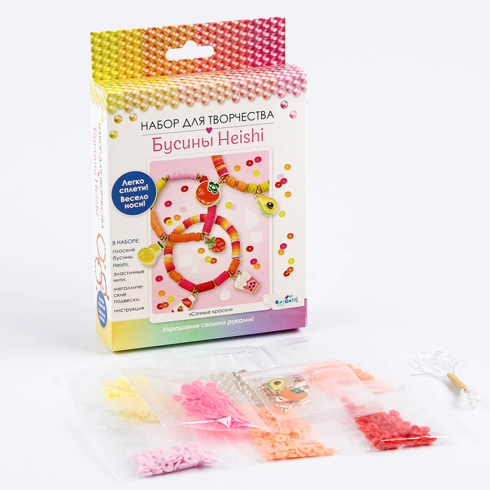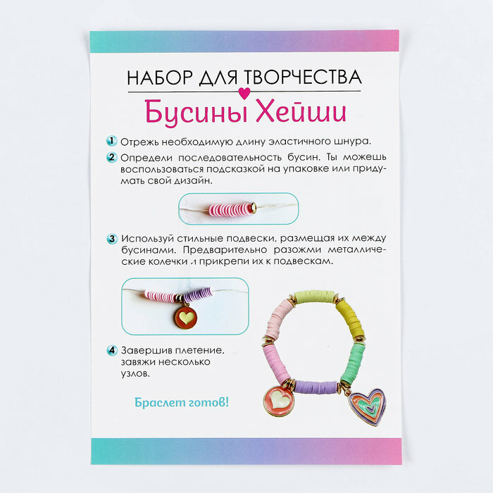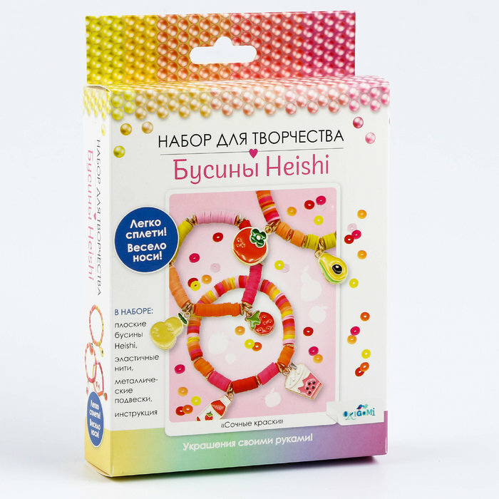 В наборе: плоские бусины Heishi, эластичные нити, металлические подвески, инструкция.