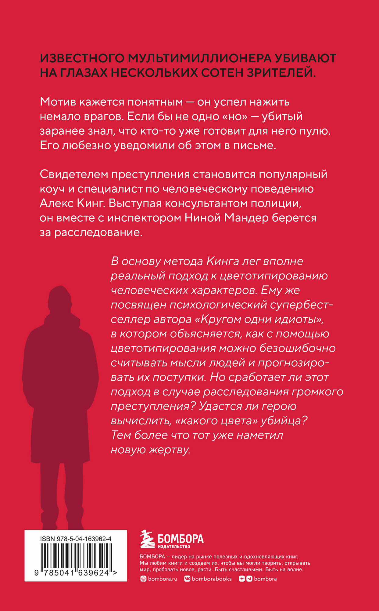 В основу метода Кинга лег вполне реальный подход к цветотипированию человеческих характеров. Ему же посвящён психологический супербестселлер автора «Кругом одни идиоты», в котором объясняется, как с помощью цветотипирования можно безошибочно считывать мысли людей и прогнозировать их поступки. Но сработает ли этот подход в случае расследования громкого преступления? Удастся ли герою вычислить, «какого цвета» убийца? Тем более что тот уже наметил новую жертву.