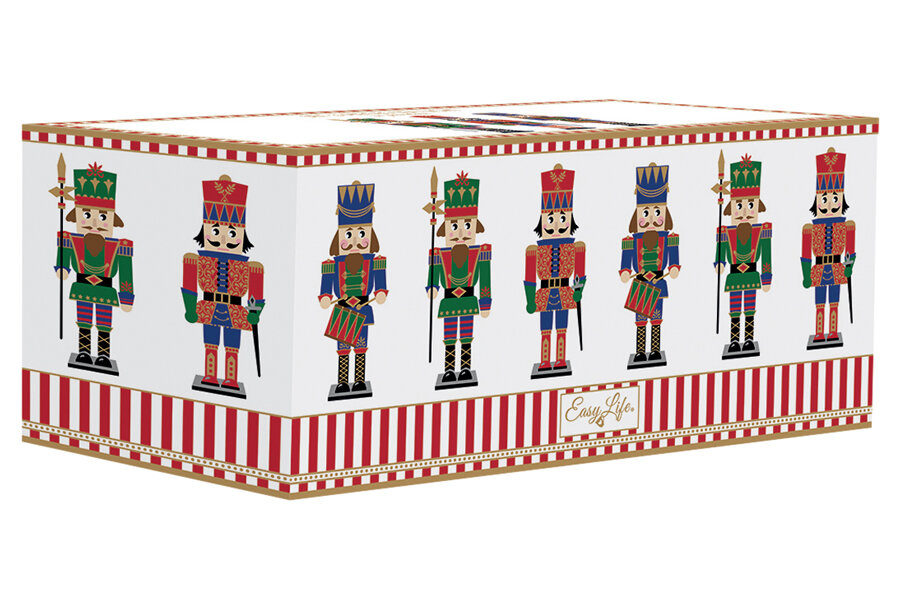 Для дизайнеров итальянского бренда Easy Life главный герой знаменитой сказки Э.Гофмана «Щелкунчик и мышиный король» стал вдохновением к созданию коллекции с ярким красочным рисунком в традиционных рождественских цветах красном, зеленом и золотом. Посуда из белоснежного фарфора с изображением Щелкунчика и новогодних атрибутов станет украшением праздничного стола, а также замечательным подарком близким и друзьям. Каждый предмет коллекции «Щелкунчик» упакован в красивую подарочную коробку.