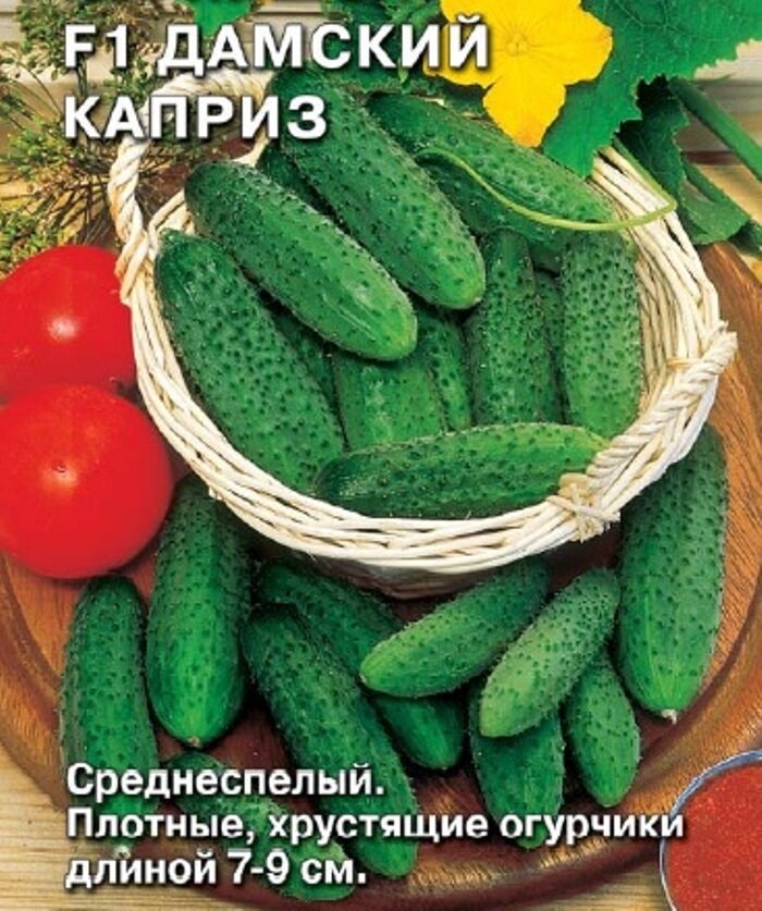 Огурец Дамский Каприз - среднеспелый салатный гибрид, от прорастания до зрелости проходит в среднем 60-65 дней. Длина 7-9 см при массе 60-70 г. Особенно хороши в свежем виде, но можно и консервировать.