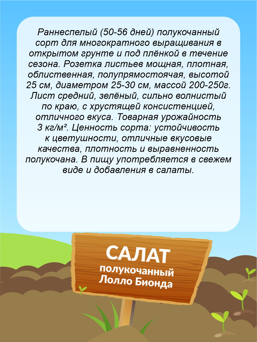 Раннеспелый (50-56 дней) полукочанный сорт для многократного выращивания в открытом грунте и под пленкой в течение сезона. Лист средний, зеленый, сильноволнистый по краю, с хрустящей консистенцией, отличного вкуса. Ценность сорта: устойчивость к цветушности, отличные вкусовые качества, плотность и выравненность полукочана. В пищу употребляется в свежем виде и добавляют в салаты.
