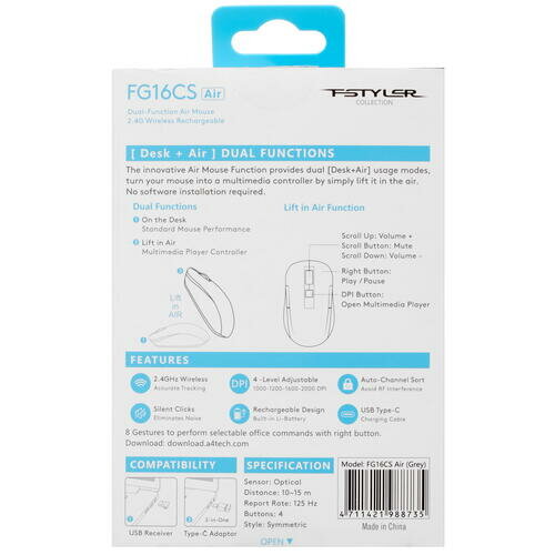 Мышь Wireless A4Tech Fstyler Air серый оптическая (2000dpi) silent USB для ноутбука (3but) 1931365 FG16CS AIR GREY