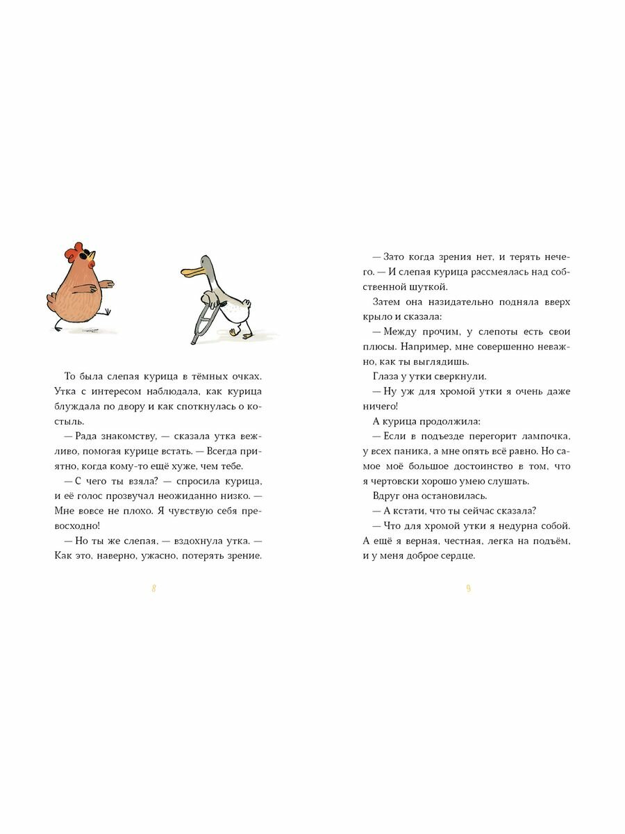 Но однажды во двор забредает слепая курица и рассказывает утке о своём заветном желании: больше всего на свете она хочет найти место, где сбываются мечты. Но как ей туда добраться, если она ничего не видит? Вот если бы у неё была спутница!..