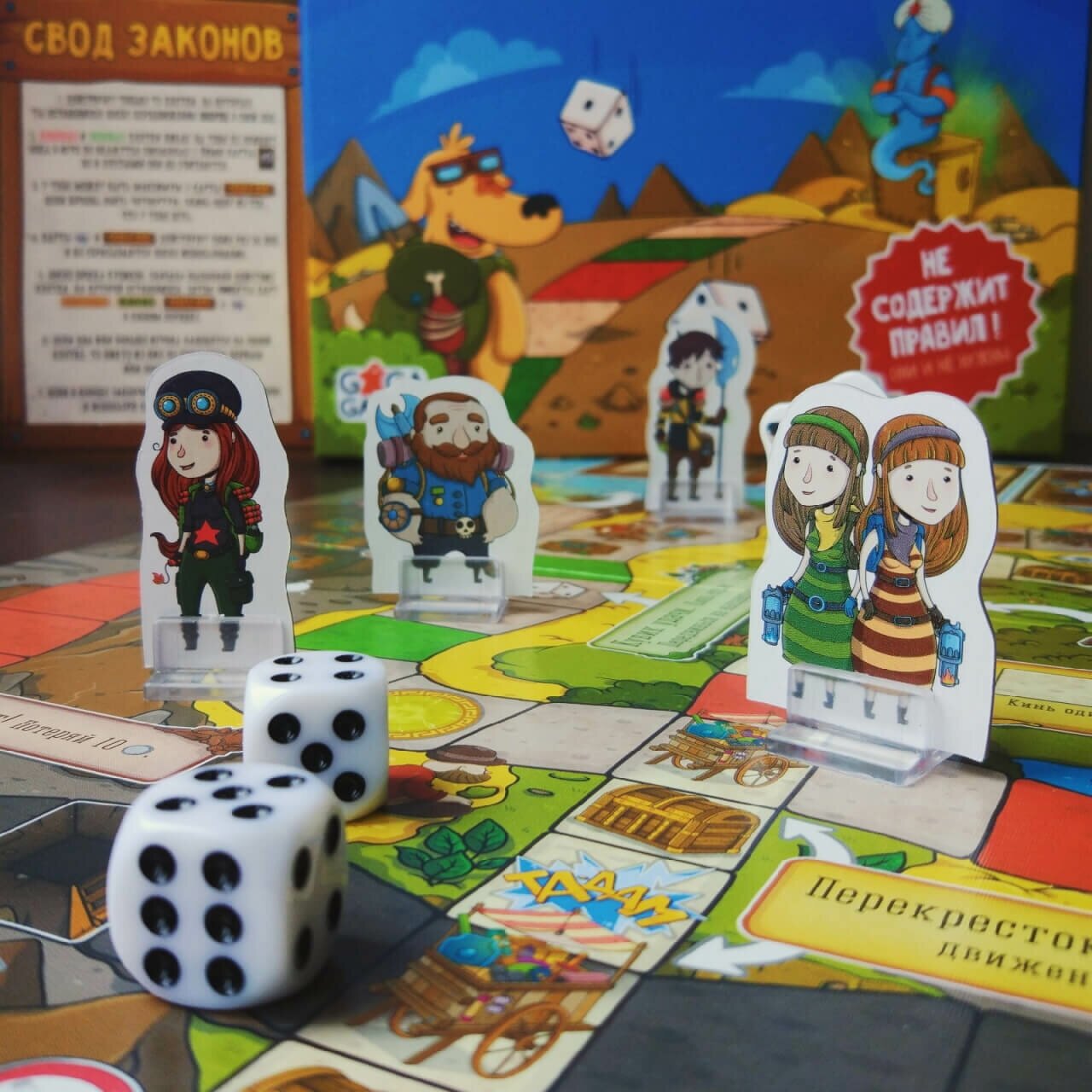 | Комплектация | • игровое поле; • 60 карт; • 90 жетонов монет; • 5 персонажей; • 5 подставок под персонажей; • 2 кубика; • жетон «Да/Нет»; • свод законов |