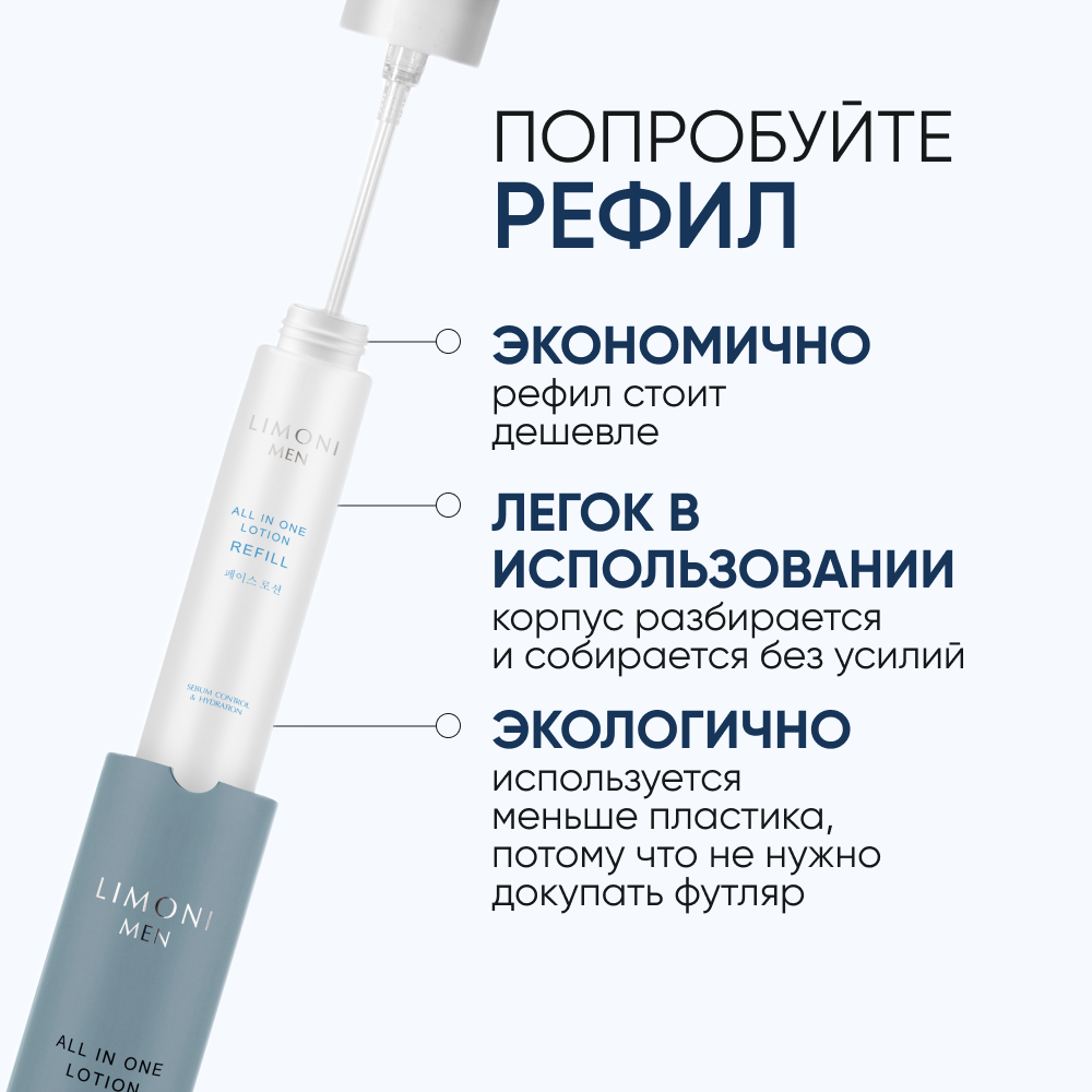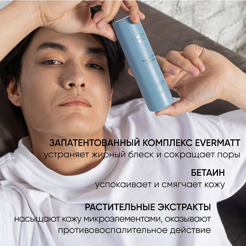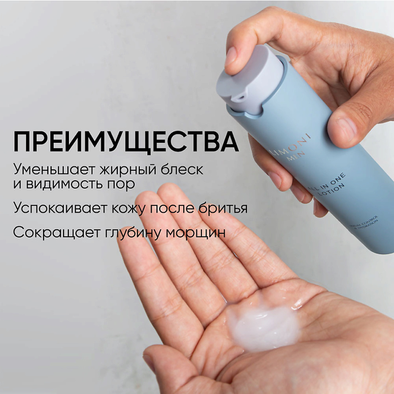 Сегодня корейская косметика известна по всему миру благодаря высокому качеству и отличному сервису, уход за красотой и здоровьем кожи лица активно интересуются и мужчины, именно поэтому LIMONI MEN представляет новинку! Встречайте крем-лосьон для лица для мужчин all in one - это идеальное решение для комплексного ухода за кожей. Уникальная легкая консистенция разработана специально для комбинированной и жирной кожи, не вызывает раздражения, успокаивает, питает и восстанавливает кожу. Этот питательный крем создан для удовлетворения потребностей и особенностей мужской кожи, обеспечивая целый ряд преимуществ в одном продукте. Он содержит фитостеролы, которые стимулируют выработку коллагена и эластина, в результате чего кожа становится более упругой и гладкой. Керамиды и комплекс Eternal P выравнивают рельеф кожи, а натуральные экстракты обеспечивают глубокое увлажнение и питание. Лосьон не вызывает раздражения, поэтому вы можете быть уверены, что он обеспечит идеальный баланс увлажнения и защиты. Может использовать как лосьон после бритья, как крем после бриться. Крем-лосьон для лица all in one для мужчин поможет сохранить увлажнение и восстановить кожу без необходимости использовать несколько средств! Крем-лосьон LIMONI станет отличным подарком своему любимому, папе или коллеге, поможет и будет полезен каждому мужчине.