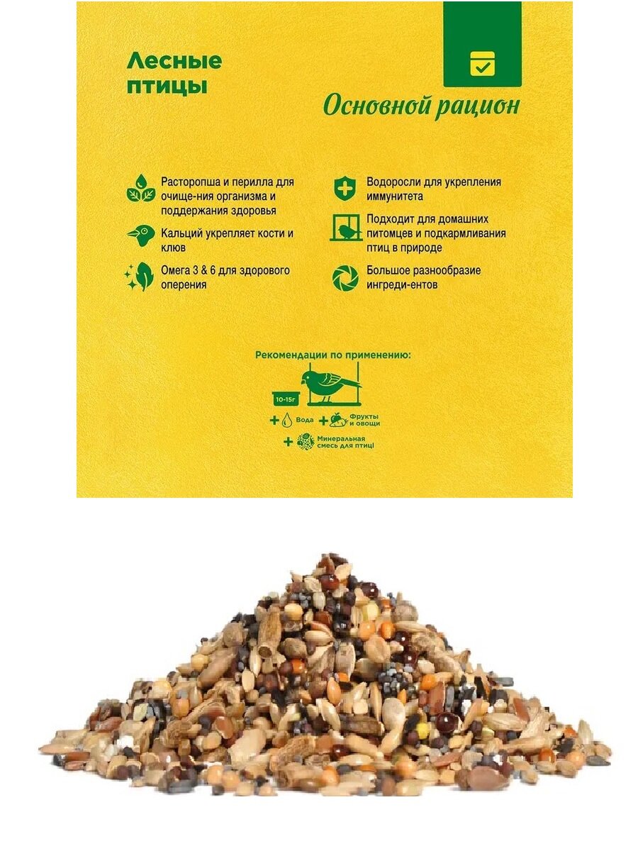Зерновая смесь RIO Wild Birds Daily Ration идеально подходит для кормления разных видов лесных птиц. Разнообразный состав включает в себя семена, которыми лесные птицы питаются в природе. Данная смесь имеет следующий состав: Канареечное семя, рапс, семена чертополоха молочного, пайза, нуг абиссинский, овсянка, просо желтое, просо красное, просо черное, семя льна, конопляное семя, мак, перилла, водоросли, глюконат кальция.