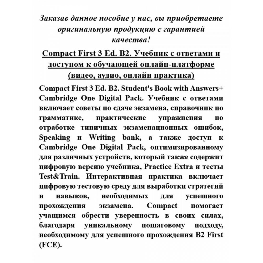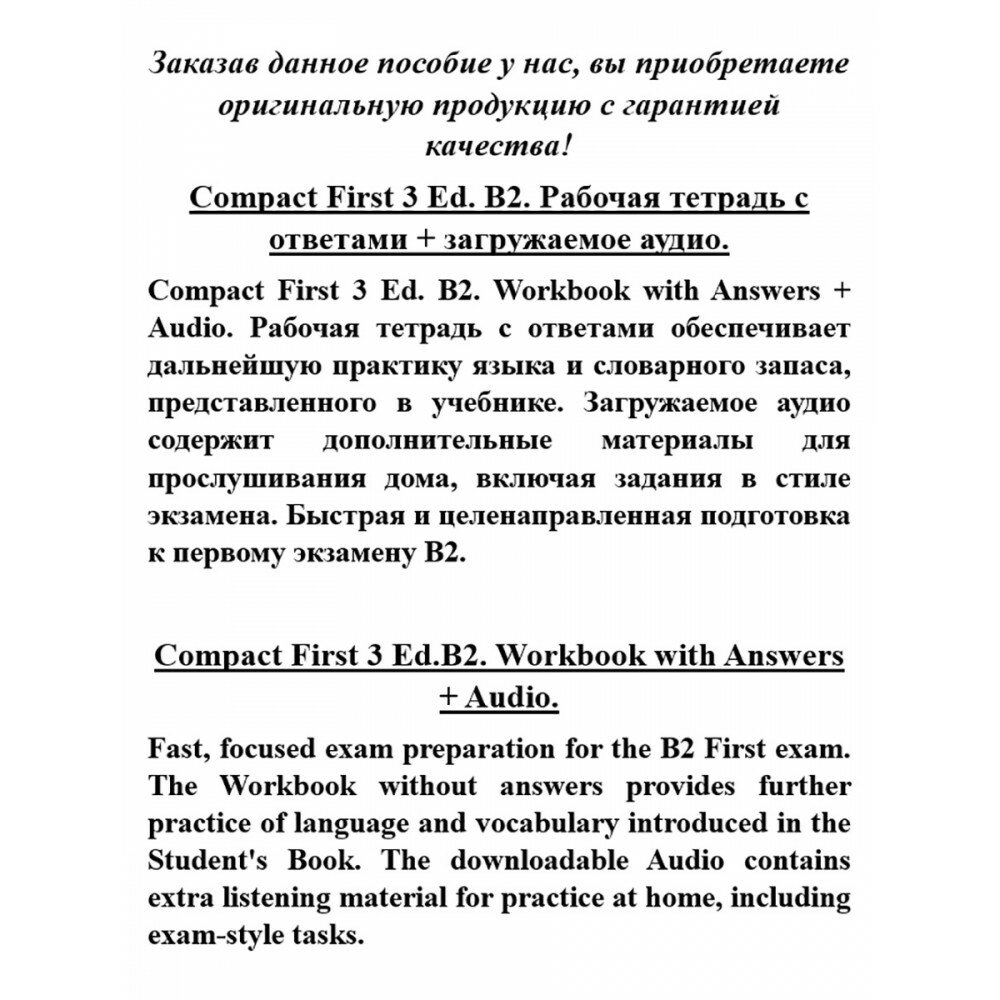 Compact предлагает интенсивную доработку материала и практику для быстрого повышения успеваемости учащихся. С помощью этого курса, благодаря четкому и сжатому обучению, учащиеся закрепят знание языка и навыки, необходимые для успешного прохождения B2 First (FCE).