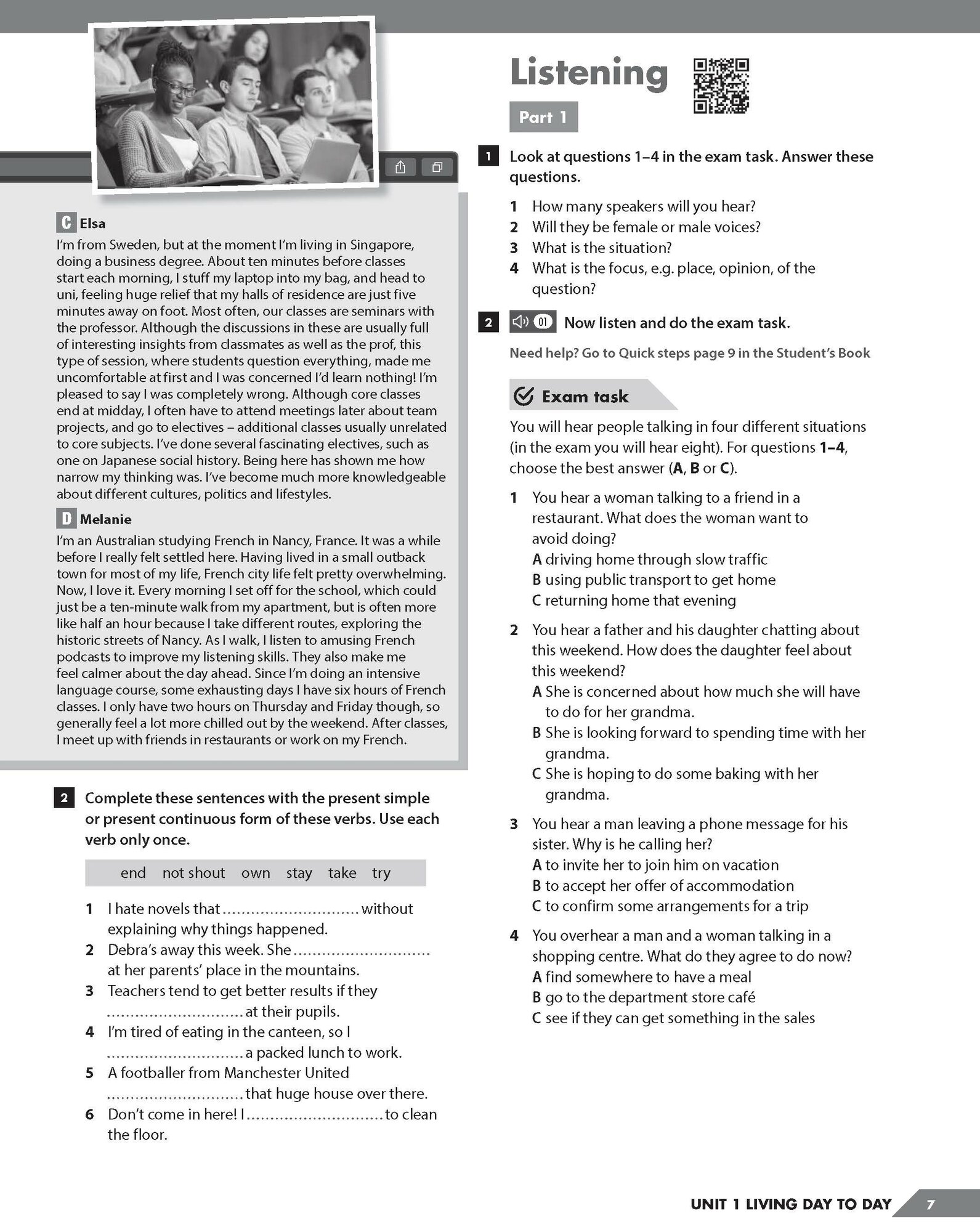 The Workbook with answers provides further practice of language and vocabulary introduced in the Student's Book. The downloadable Audio contains extra listening material for practice at home, including exam-style tasks.