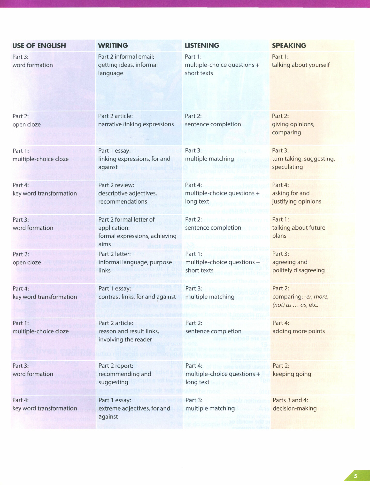 Compact помогает учащимся обрести уверенность в своих силах, благодаря уникальному пошаговому подходу, и обучает основным стратегиям сдачи экзамена с помощью удобных советов. Грамматические разделы, относящиеся к конкретному экзамену, и справочник по грамматике углубляют понимание языковых структур, в то время как банк разговорной речи и банк письменной речи расширяют владение продуктивными навыками.