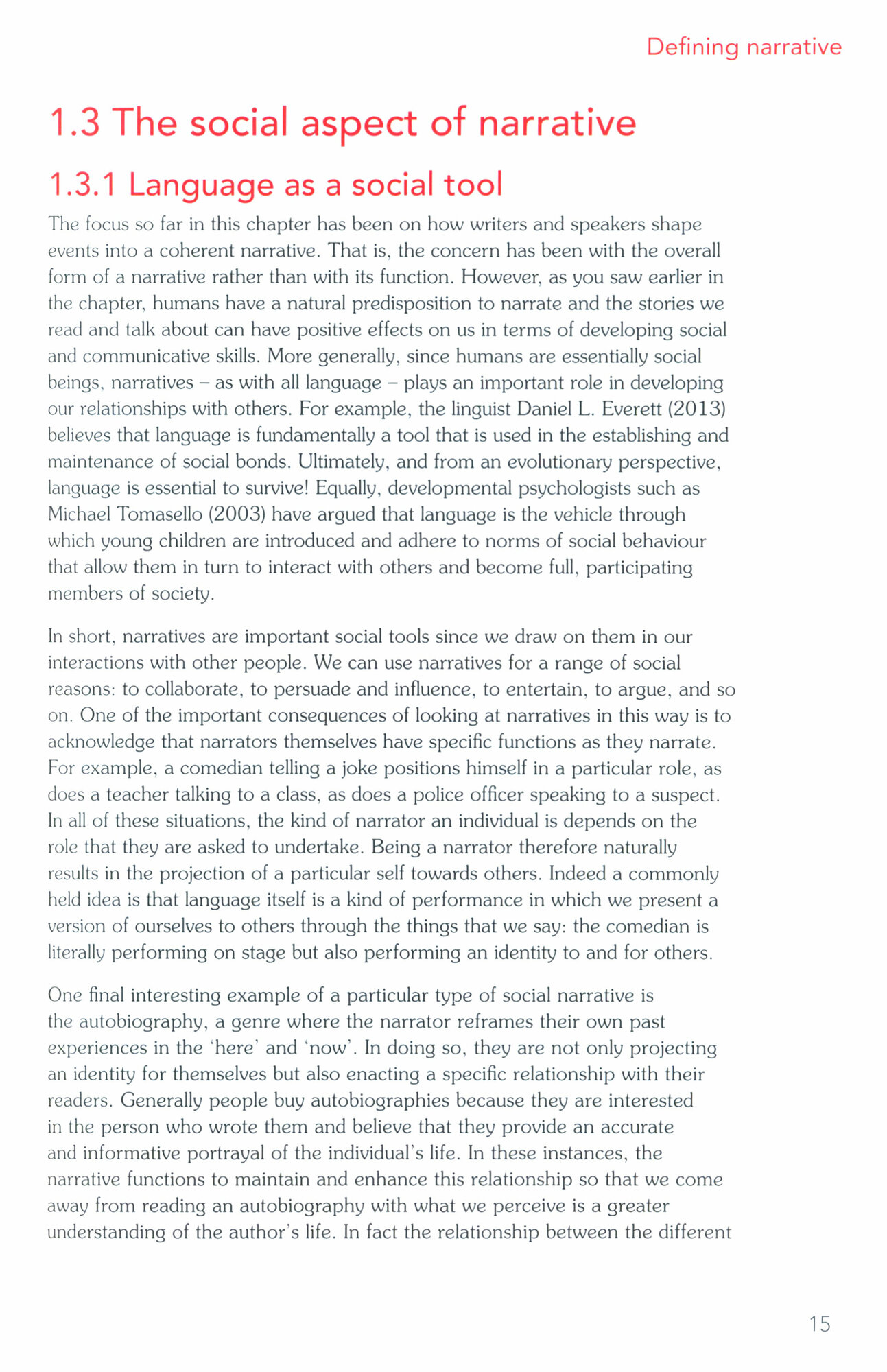 Narrative is an introduction to the ways we use language to tell stories. It is suitable for advanced level students and beyond. Written with input from the Cambridge English Corpus, it explores texts from a range of genres, mediums and periods, written for different audiences and purposes. This includes examples such as hard news stories, narratives from children and examples from Twitter. Using short activities to help explain analysis methods, this book guides students through major modern issues and concepts. It summarises key concerns and modern findings, while providing inspiration for language investigations and non-examined assessments (NEAs) with research suggestions.