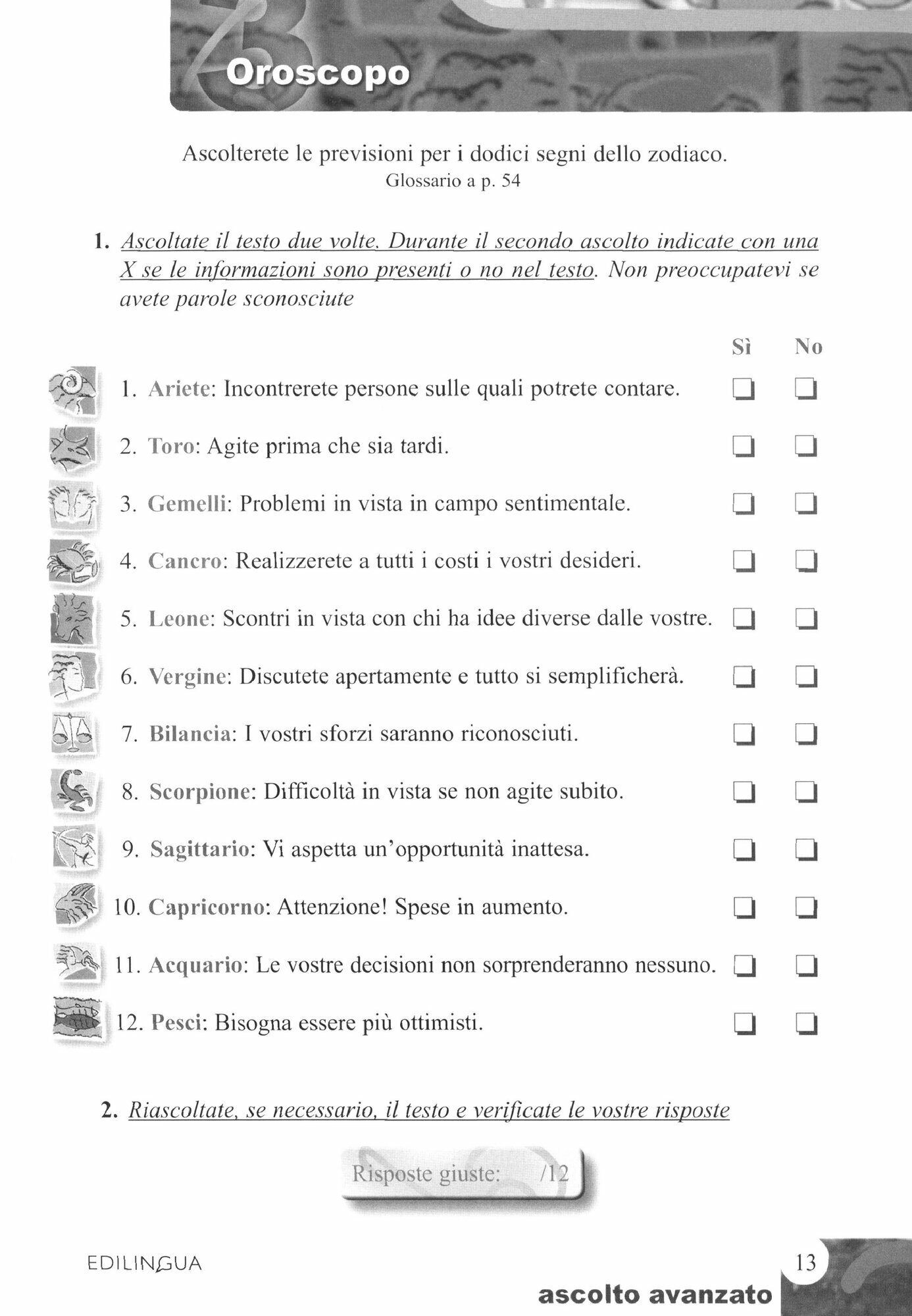 Ascolto Avanzato mira allo sviluppo dell’abilita di ascolto e. nello stesso tempo, alla preparazione della prova di comprensione orale degli esami delle certificazioni delle Universita di Perugia (Celi 4 e 5) e Siena (Cils Tre-C1 e Quattro- C2), Plida (C1 e C2) o altri simili.