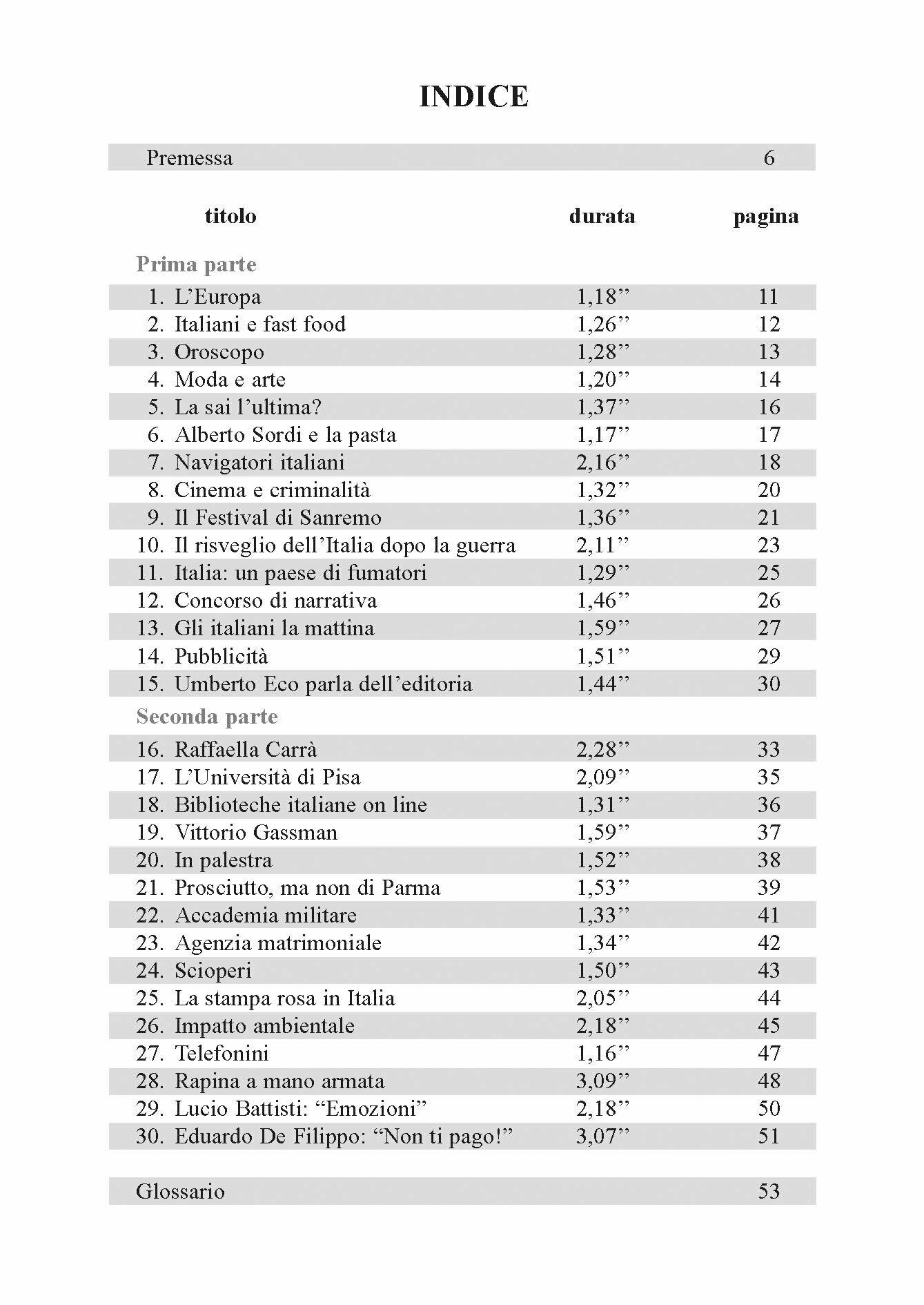 Tutti i brani sono stati accuratamente selezionati da programmi televisivi e radiofonici trasmessi da emittenti italiane. Essi coprono un’ampia gamma di argomenti: dialoghi telefonici, ricette, favole, interventi, fatti di cronaca, interviste, servizi sulla cultura e cosi via. Cosi lo studente ha la possibilita di entrare in contatto non solo con la lingua viva, ma anche con la realta italiana. Inoltre, le numerose e differenti voci dei brani orali gli consentono di migliorare l’accento, la pronuncia e l’intonazione.