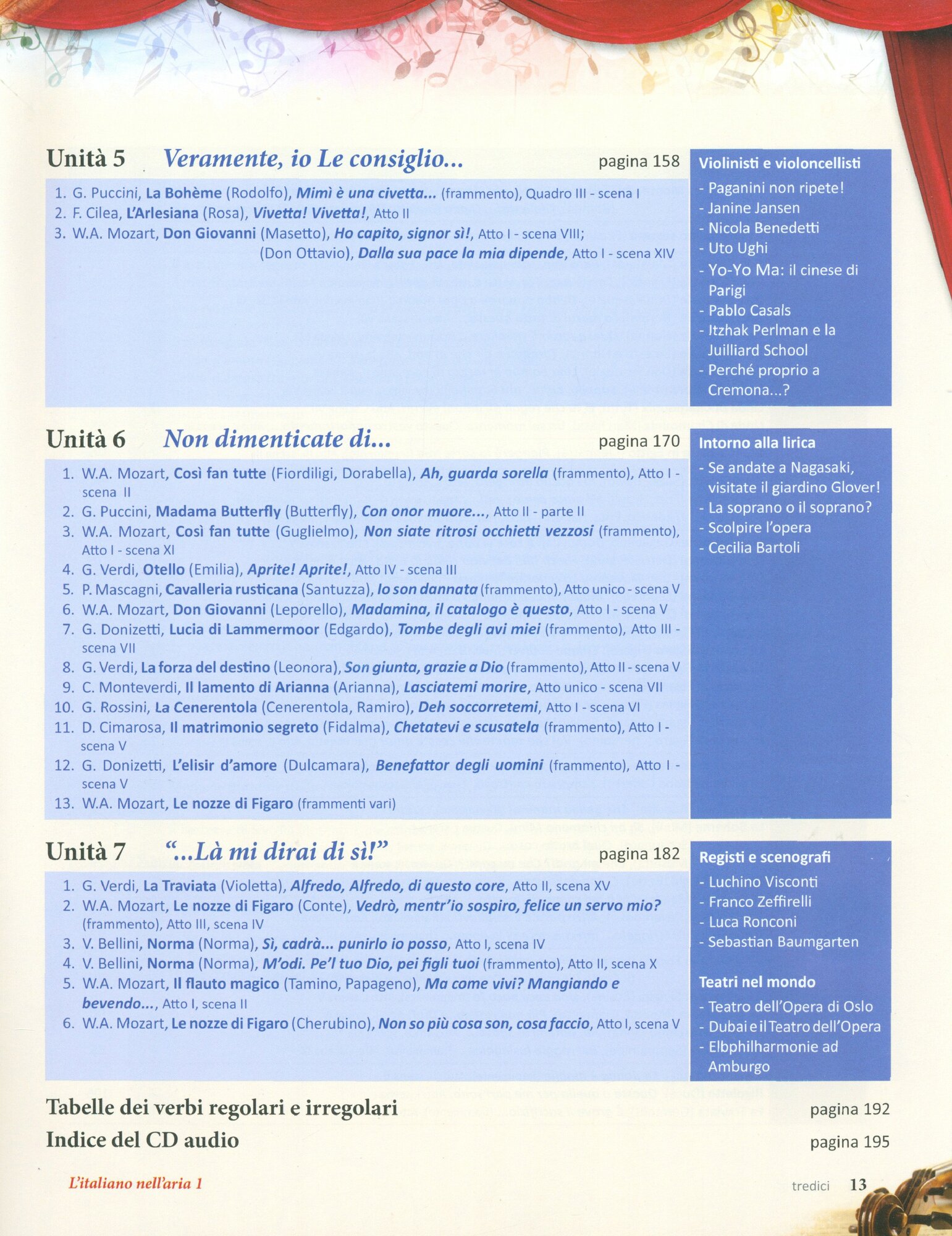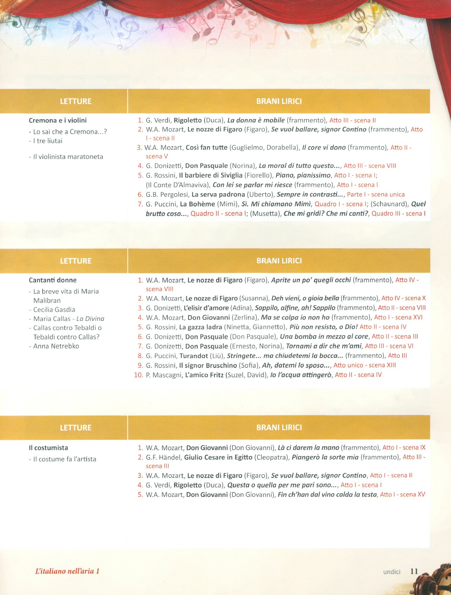 L’italiano nell’aria e un corso di lingua italiana in due volumi indirizzato ad apprendenti stranieri, di qualsiasi provenienza linguistica e anche principianti assoluti, dei conservatori, delle scuole di musica, delle universita, degli IIC e delle scuole di musica in Italia che offrono corsi specifici di lingua italiana per l’opera, nonche ad appassionati di lirica e a tutti coloro che vogliono imparare l’italiano per capire meglio i libretti.