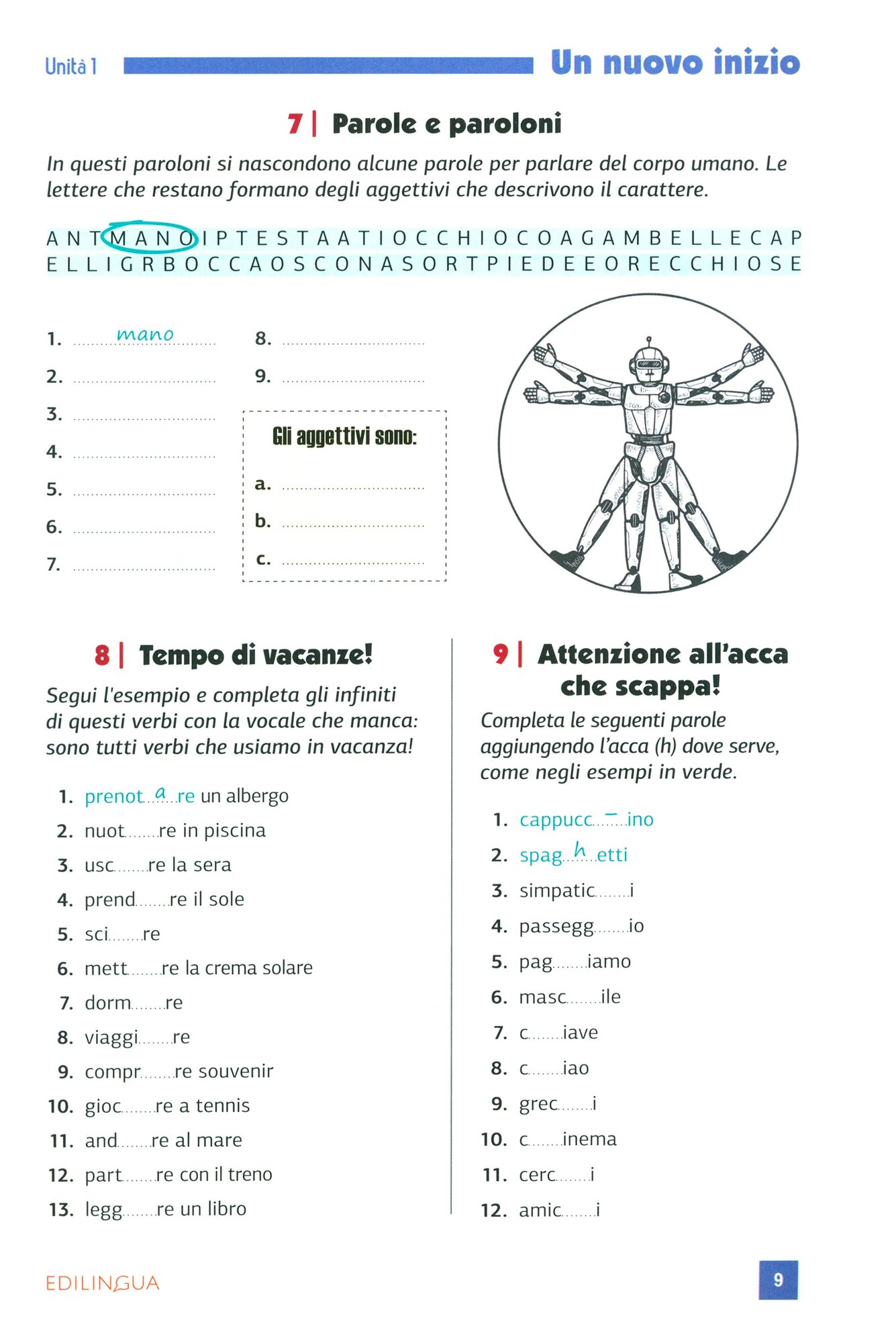 Il volume e suddiviso in 11 unita che coprono i livelli A1-A2 del Quadro Comune Europeo di Riferimento delle Lingue. Ogni unita presenta attivita brevi e originali su lessico, grammatica, espressioni e curiosita culturali, quali ad esempio crucipuzzle, cruciverba, rebus, indovinelli e completamenti. Grazie alle chiavi incluse, puo essere usato in classe o in autoapprendimento.