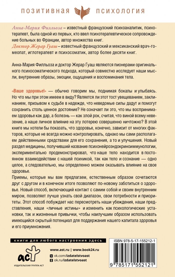 «Ваше здоровье!..» – обычно говорим мы, поднимая бокалы и улыбаясь. Но что мы при этом имеем в виду? Является ли этот тост увещеванием, заклинанием, призывом к судьбе в надежде, что неведомые силы дадут и помогут сохранить столь ценное достояние? Не означает ли это, что мы воспринимаем здоровье как дар, а болезнь – как злой рок, считая, что виной всему «невезение», а наше личное влияние на эту лотерею совершенно ничтожно? В этой книге, появившейся в результате длительного общения с людьми – общения, состоявшего из боли и радостей, страданий и хорошего самочувствия, удовольствий и разочарований, — мы хотели бы показать, что здоровье, конечно, зависит от многих факторов, которые не всегда можно контролировать, однако мы сами располагаем действенными средствами для его сохранения, а то и улучшения. Новый раздел медицины, получивший расширительное название психонейроэндокриноиммунологии, экспериментально продемонстрировал, что наше тело находится в постоянном взаимодействии с нашей психикой, так как тело и сознание — одно целое, а следовательно мы определенно можем оказывать влияние на свое здоровье. Приемы, которые мы вам предлагаем, естественным образом сочетаются друг с другом и в конечном итоге позволяют по-новому заботиться о здоровье. Новый способ, включающий контакт с самим собой и своим внутренним миром, позволяет лучше узнать свой диапазон, свои потребности и приоритеты. Этот способ побуждает нас пересмотреть наши убеждения, наши представления, наши «личные истины» и изменить как психологические установки, так и жизненные привычки, чтобы наилучшим образом использовать имеющийся скрытый потенциал для поддержания нашего капитала здоровья и его приумножения. Об авторах: Анна-Мария Филльоза – известный французский психоаналитик, психотерапевт, была одной из первых, кто ввел психотерапевтическое сопровождение больных во Франции. Доктор Жерар Гуаш – известный французский и мексиканский врач-гомеопат, иглотерапевт и психосоматик, автор более десяти книг. Анна-Мария Филльоза и доктор Жерар Гуаш, являются пионерами оригинального психосоматического подхода, который совместно исследует наши мысли, внутренние образы, эмоции, ощущения и воспоминания тела.