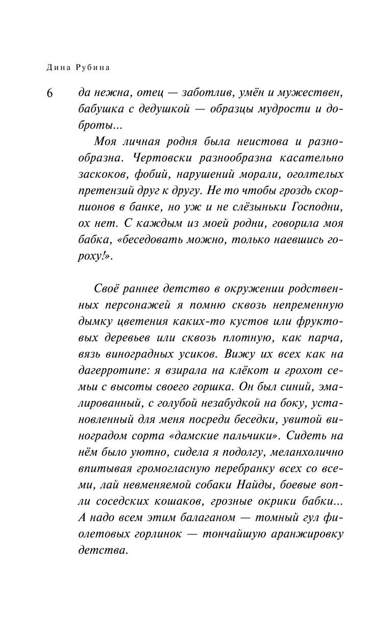 «Моя личная родня была неистова и разнообразна. Чертовски разнообразна касательно заскоков, фобий, нарушений морали, оголтелых претензий друг к другу. Не то чтобы гроздь скорпионов в банке, но уж и не слёзыньки Господни, ох нет. С каждым из моей родни, говорила моя бабка, "беседовать можно, только наевшись гороху!"».