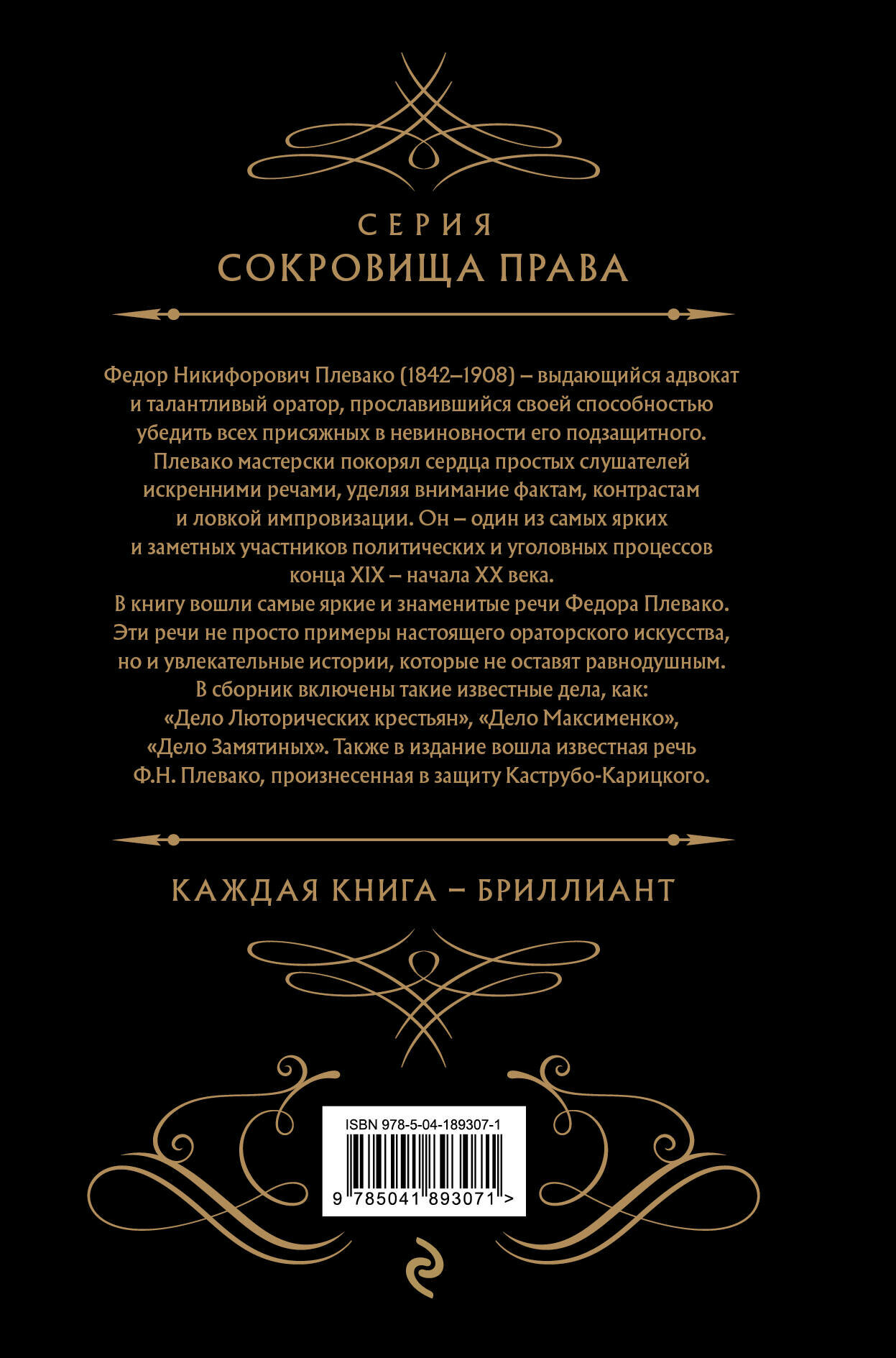 В книгу вошли самые яркие и знаменитые речи Федора Плевако. Эти речи не просто примеры настоящего ораторского искусства, но и увлекательные истории, которые не оставят равнодушным. В сборнике включены такие известные дела, как: «Дело Люторических крестьян», «Дело Максименко», «Дело Замятиных». Также в издание вошла известная речь Ф.Н. Плевако, произнесенная в защиту Каструбо-Карицкого.