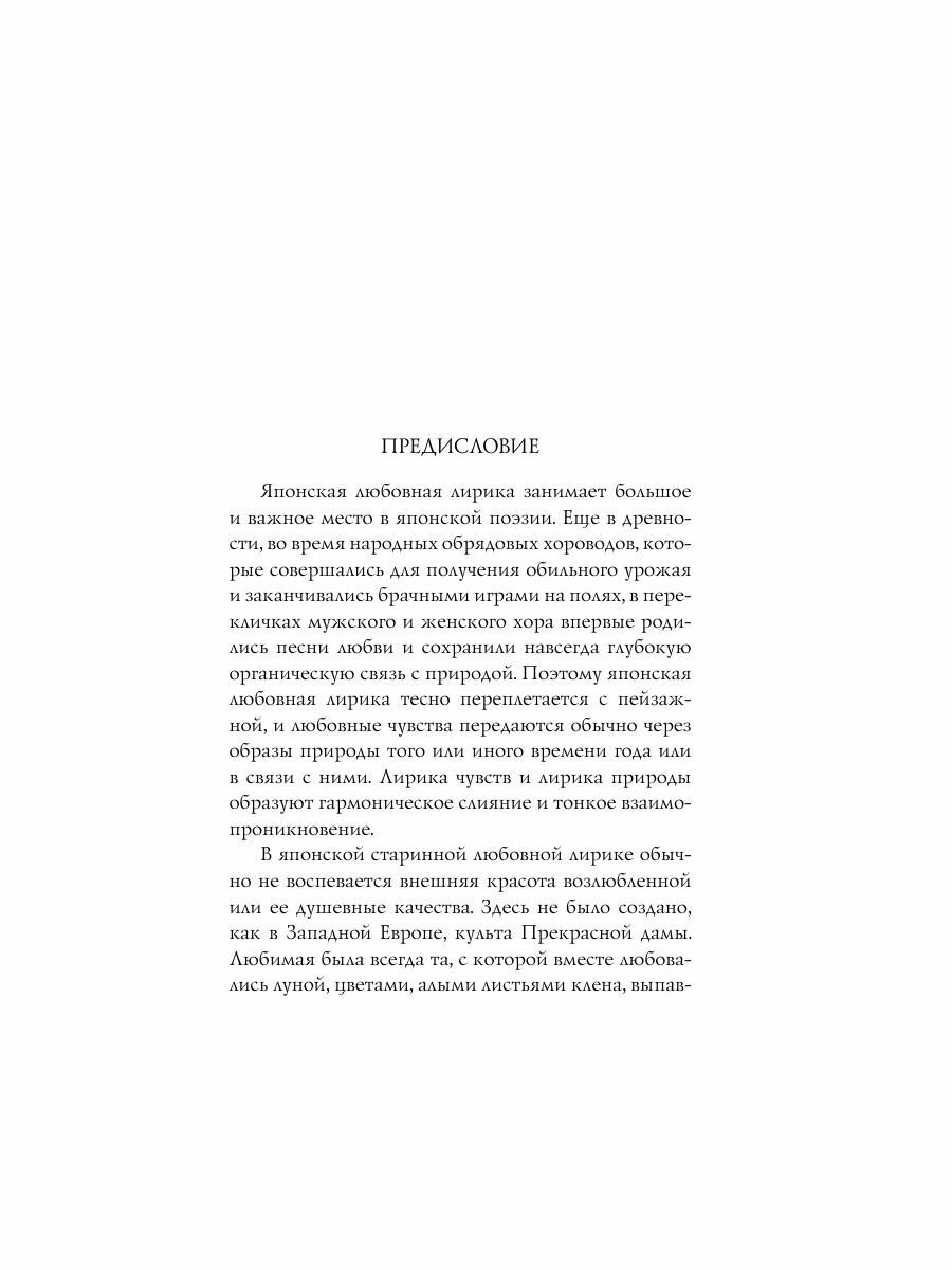 Впервые за много лет читателю открывается мир классической японской любовной лирики в переводах Анны Глускиной — одной из важнейших советских японисток, лично составившей эту антологию в конце восьмидесятых годов. Минималистичная, но полная нежности японская поэзия не стареет с веками, вновь и вновь оказываясь поразительно актуальной, помогая преодолеть житейские трудности или выразить казалось бы невыразимые чувства. В книгу вошли стихотворения VIII, X и XIII веков, внимательно отобранные из трёх лучших японских поэтических антологий и прокомментированные переводчицей, работа которой передаёт все нюансы классического японского стихосложения на русском языке. Обновленное оформление серии «Собрание больших поэтов» с иллюстрацией на полный разворот обложки придаёт книге ещё большее изящество, а удобный формат сборника позволяет взять его с собой в дорогу, чтобы погрузиться в мир японской поэзии в любом месте и в любое время.