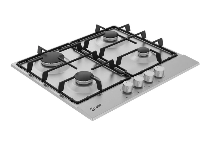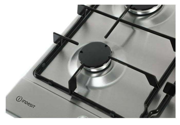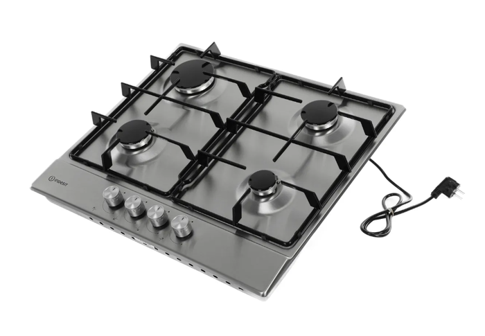 Газовая варочная поверхность Indesit представлена панелью из серебристой нержавеющей стали, на которой расположены 4 разноразмерных конфорки. Такое решение делает ее подходящим для кухни большой семьи, где готовятся сразу по несколько блюд. Посуда устанавливается на 2 раздельные решетки из чугуна.