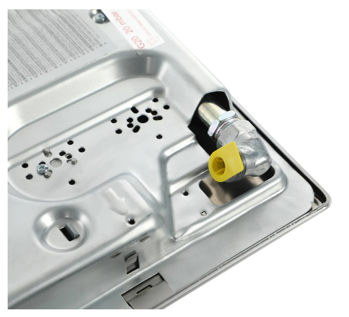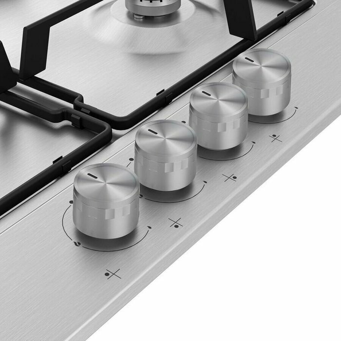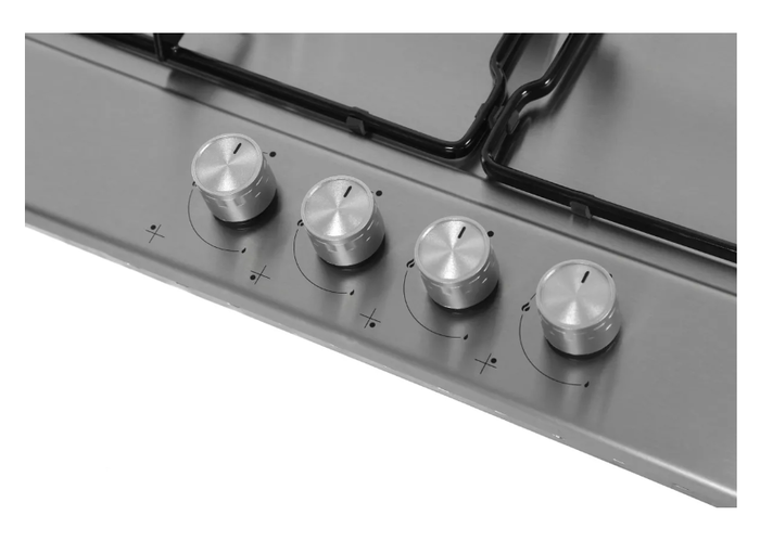 Газовая варочная поверхность из нержавеющей стали. С плавной регулировкой пламени. Есть 4 конфорки разных размеров. Минимальный диаметр посуды — 80 мм, максимальный — 260 мм.