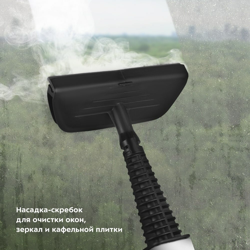 Идеальная чистота – забота моя! – устройство, которое поможет избавиться от грязи с помощью мощной струи пара, а также продезинфицирует поверхность. Прибор можно использовать как 5 устройств: паровая швабра, ручной пароочиститель, стеклоочиститель, отпариватель и дезинфектор. Регулируйте подачу пара При включении прибора загорится индикатор, и начнётся нагрев бойлера. Время нагрева составляет около 30 секунд! После разогрева бойлера можно начать работу при слабой подаче пара или увеличить силу подачи пара, повернув регулятор по часовой стрелке. Ручной модуль и насадки для разных типов уборок Скребок, нейлоновые щётки очищают стойкие загрязнения. Насадка для отпаривания со скребком используется для отпаривания вещей и чистки окон, зеркал. Также в комплекте идут 1 угловая и 3 струйные насадки, которые помогут очистить щели и углы. Для качественной уборки Принцип действия парогенератора основан на воздействии горячего пара на загрязнения. Пар проникает внутрь загрязнения, размягчая и растворяя его, а затем с помощью тряпки частички грязи смываются. Высокая температура пара способствует процессу очистки. Съёмный резервуар 370 мл Швабра оснащена резервуаром для воды ёмкостью 370 мл. Резервуар снимается со швабры, поэтому его можно легко наполнить и вымыть. Во время работы парогенератора вода из резервуара проходит через специальный фильтр. Удобное хранения шнура длиной 8 метров При хранении швабра не займёт много места. Шнур длиной 8 м не сковывает и не ограничивает ваше перемещение во время уборки. На ручке и корпусе швабры имеются держатели для смотки шнура. Всё необходимое в комплекте! Множество насадок, которые идут в комплекте с паровой шваброй, справятся с труднодоступными местами и сложными поверхностями. Стакан для наливания воды служит для удобного и безопасного наливания воды в резервуар.