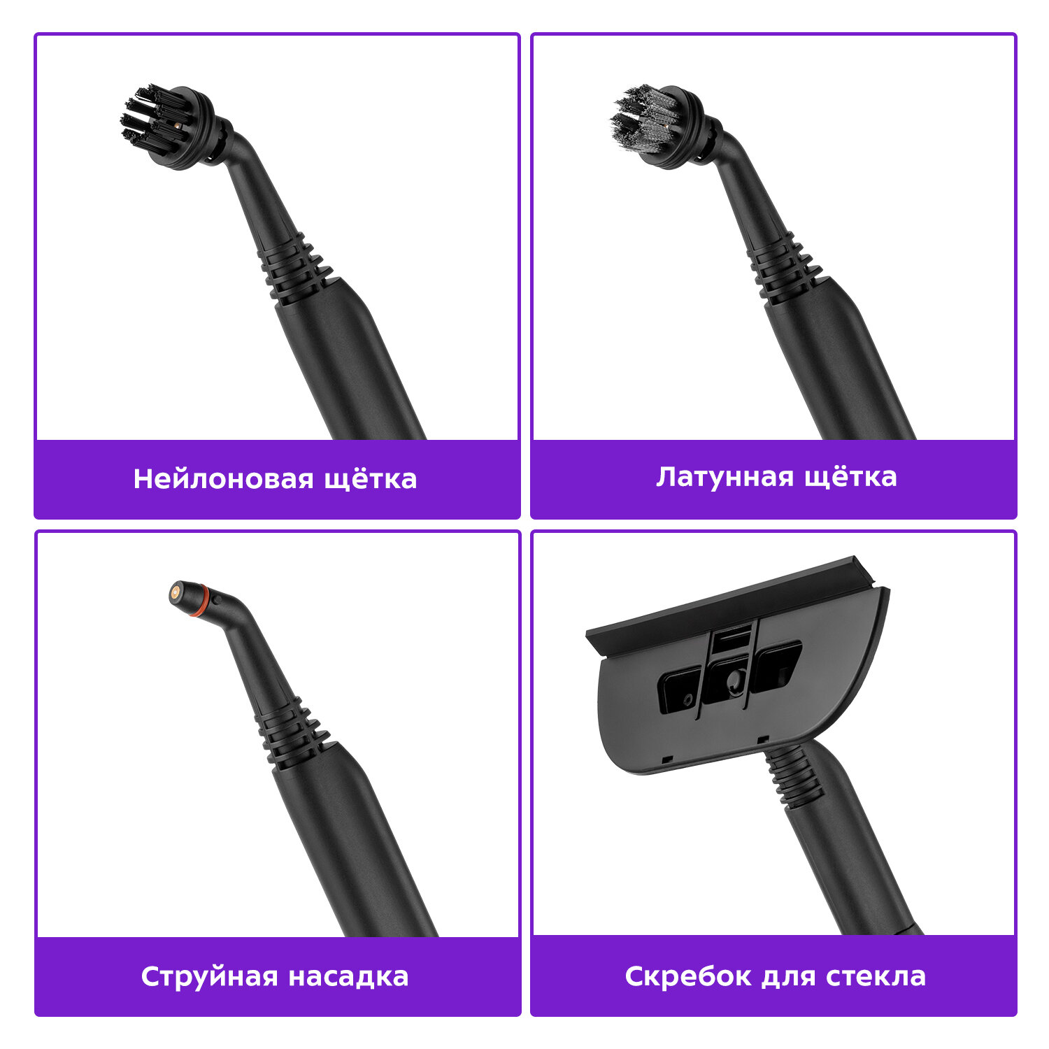 | В комплекте | паровой пистолет, форсунка точечной струи, круглая щетка, высоконапорная форсунка, форсунка для мытья окон, форсунка для чистки пола |