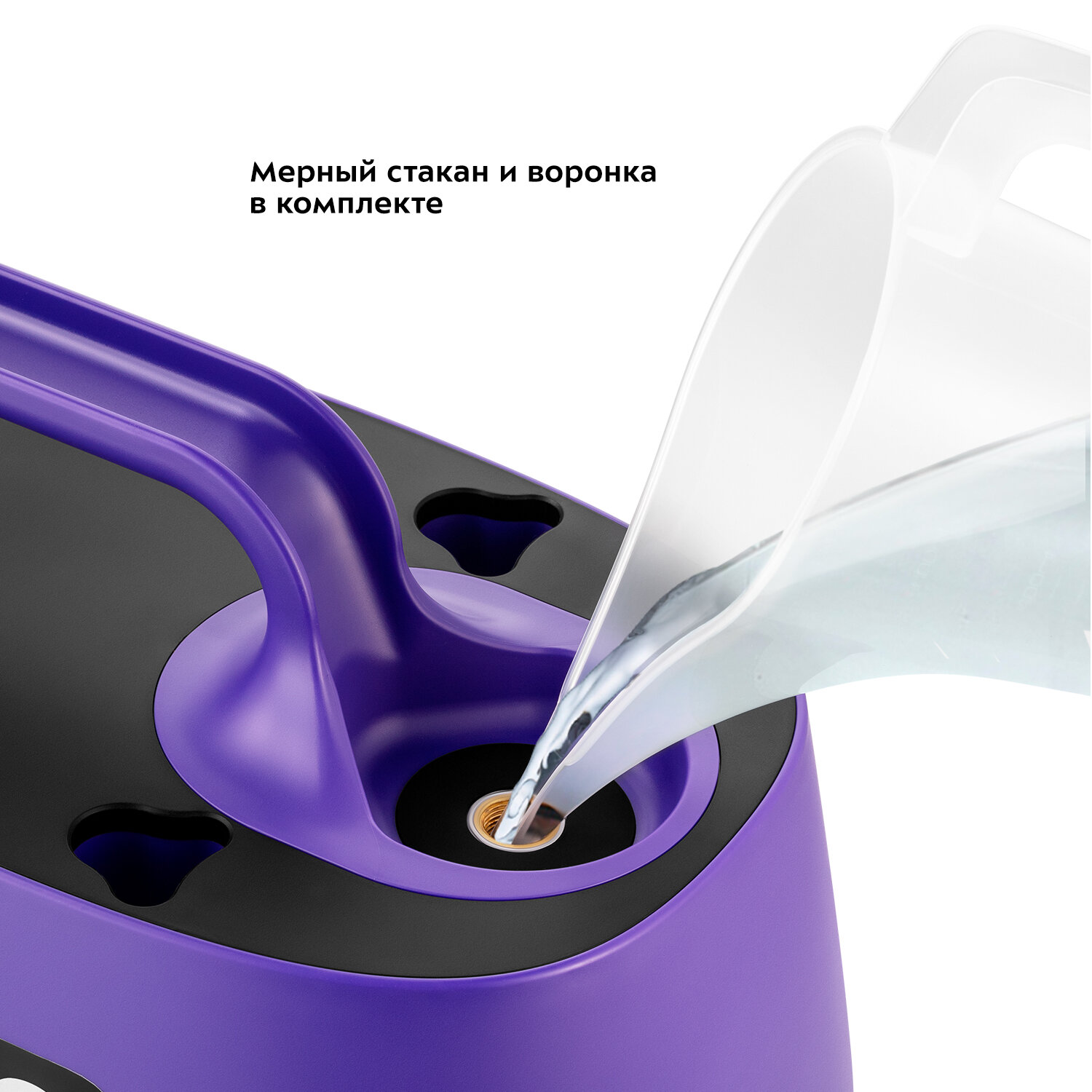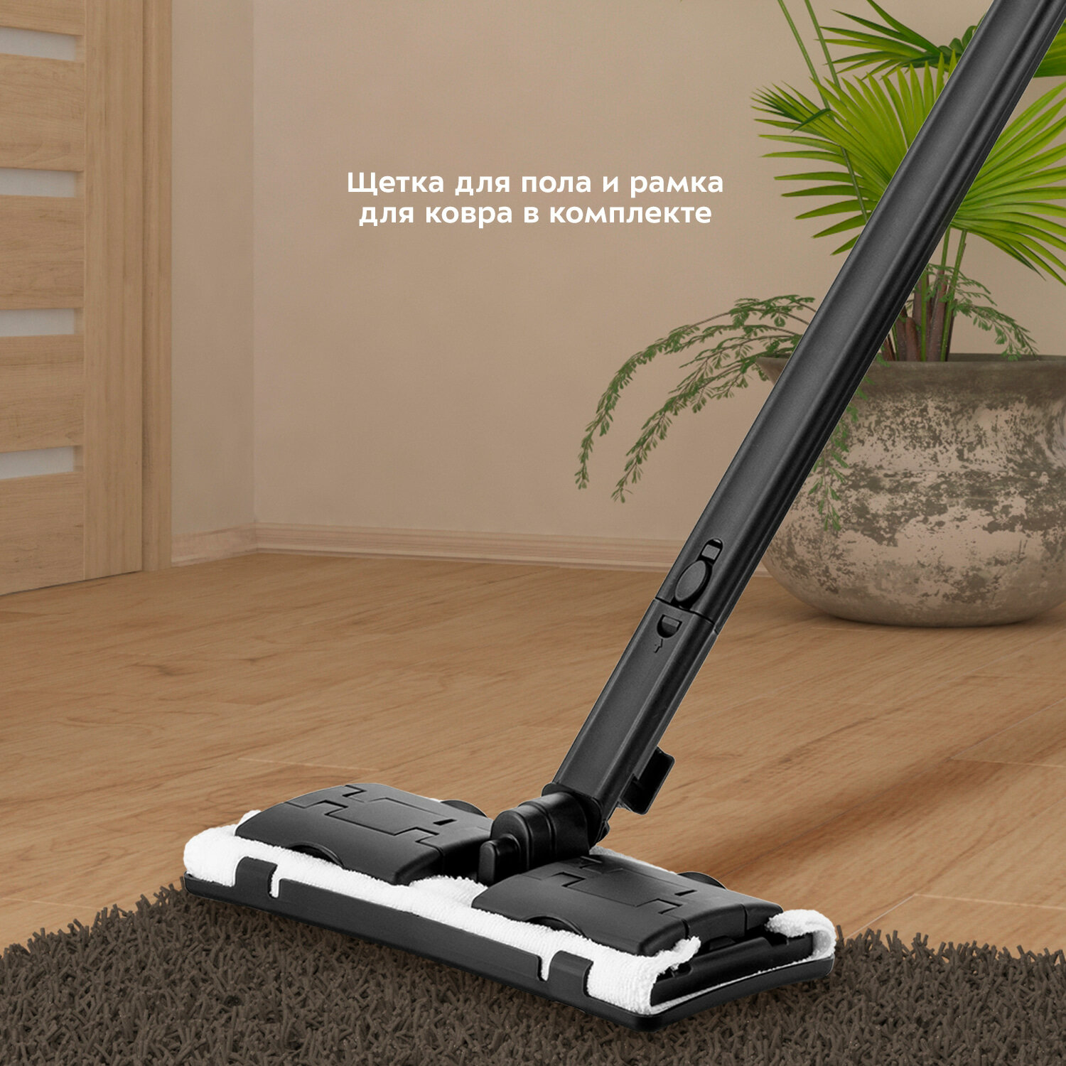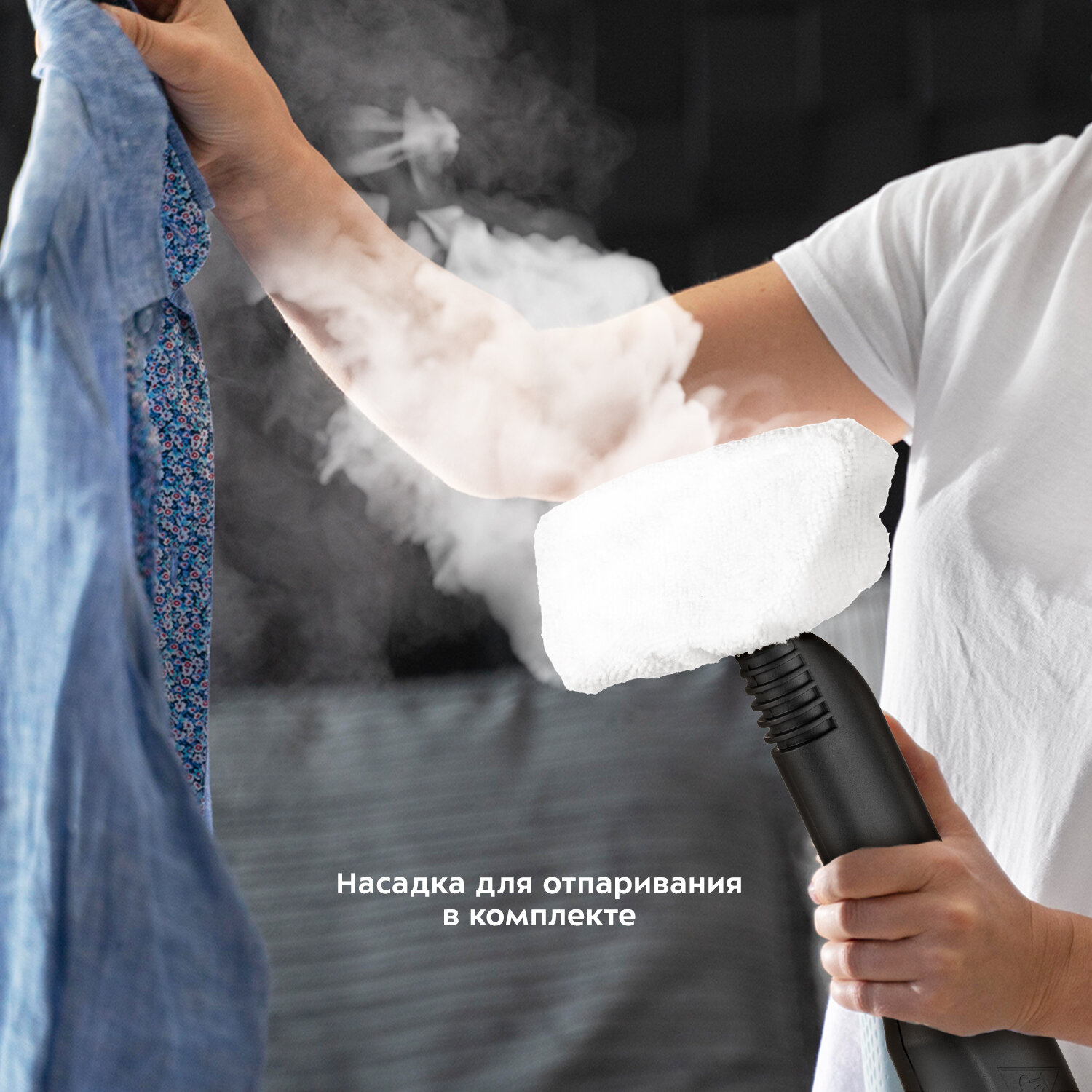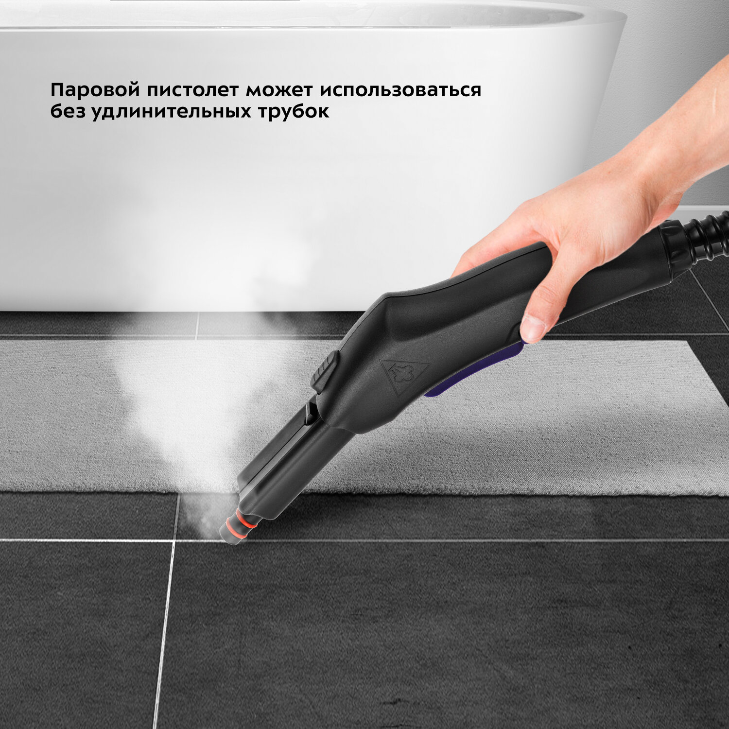 Чисто там, где я! Пароочиститель — многофункциональный аппарат, способный заменить паровую швабру, дезинфектор, стеклоочиститель и отпариватель для тканей. Используя струю горячего пара, устройство отлично очищает поверхности и обеспечивает деликатную глажку вещей. Полный комплект! Скребок для стекла используется для мойки окон, зеркал, кафеля. Струйная насадка подходит для чистки плинтусов. Нейлоновая и латунная щётки - для удаления стойких и особо стойких загрязнений. Широкая ворсовая - для очистки решётчатых поверхностей. Простая регулировка Удлинительная трубка надевается на паровой пистолет, а с другой стороны к ней присоединяется струйная насадка, насадка для отпаривания или щетка для пола. Для увеличения длины трубки к первой удлинительной трубке присоединяется вторая. Насадка для отпаривания Она используется для отпаривания одежды и чистки обивки мягкой мебели. Рекомендуется надеть на насадку тряпку для отпаривания: при отпаривании в тряпку будет впитываться конденсат и загрязнения. Щётка для пола Данная насадка предназначена для удаления грязи с напольных покрытий. В комплекте также идёт рамка для ковра, которая облегчает скольжение напольной щётки по ковру и предотвращает соскальзывание тряпки с щётки для пола. Используйте без насадок Паровой пистолет может использоваться без удлинительных трубок для очистки углов, плинтусов и других труднодоступных мест. Сопло парового пистолета сужено, поэтому оно создает мощную струю пара, способную своим напором выбить грязь из щелей и углублений. Прост в эксплуатации Кнопка «Вкл/Выкл» запускает нагрев бойлера и отключает устройство. Когда устройство включено- горит индикатор «Питание». Индикатор «Пар» загорается, когда бойлер нагрелся и пароочиститель готов к подаче пара и гаснет, когда давление пара в бойлере падает. Продумано до мелочей! В комплекте с пароочистителем идёт мерный стакан и воронка для удобного добавления воды в бойлер. Ёмкость составляет 1,6 л. На корпусе пароочистителя есть ручка для переноса.