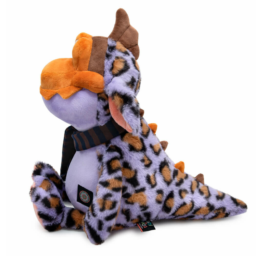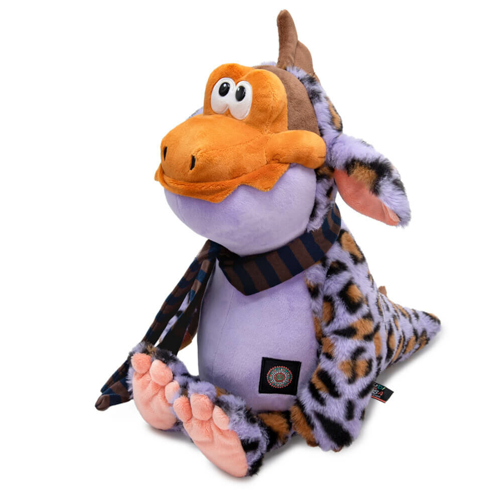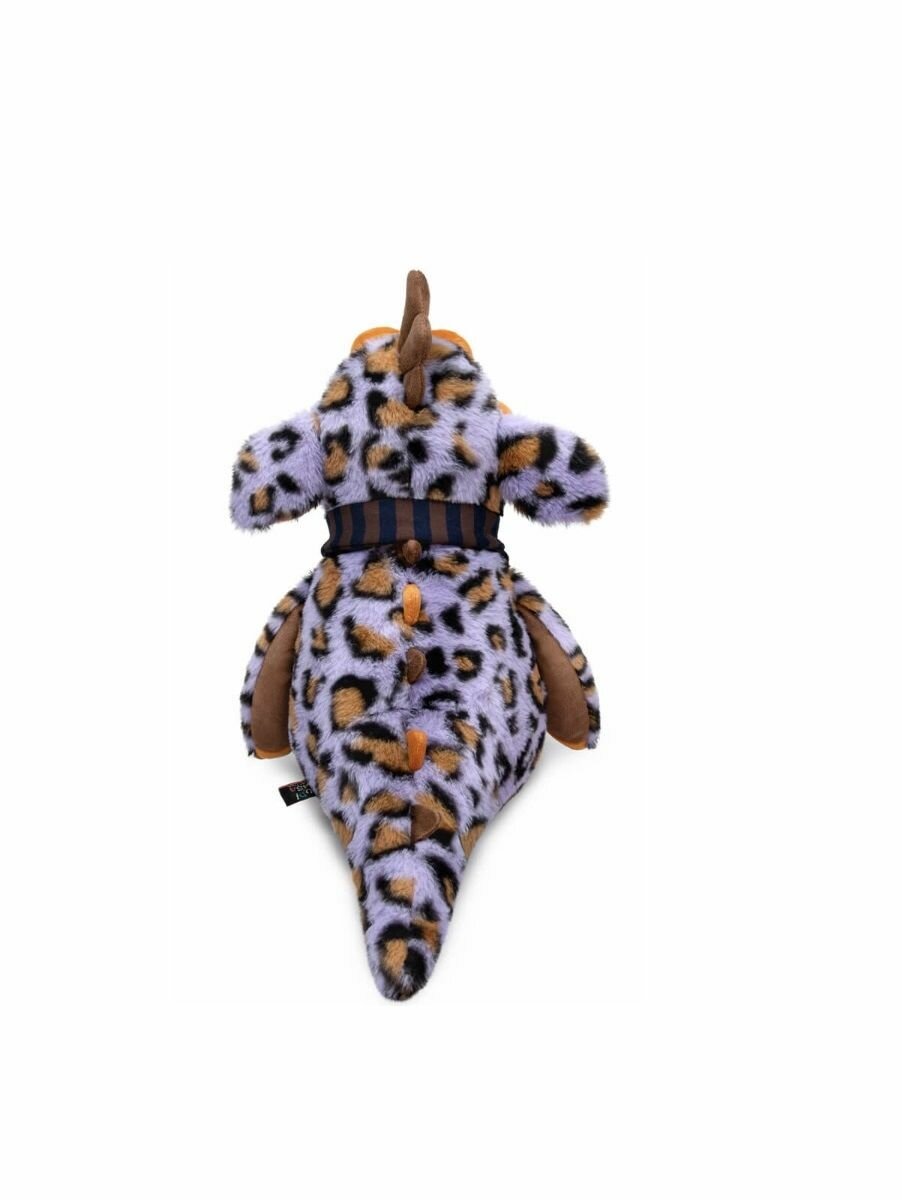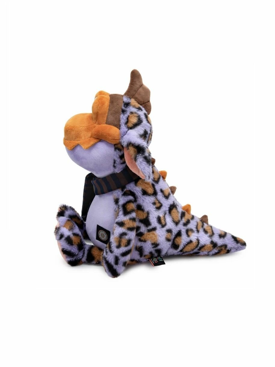 Очень красивый дракон Йорни сшит из пятнистого меха и мягкого софта. На Йорни завязан длинный узкий шарфик из плотного трикотажа в полоску.