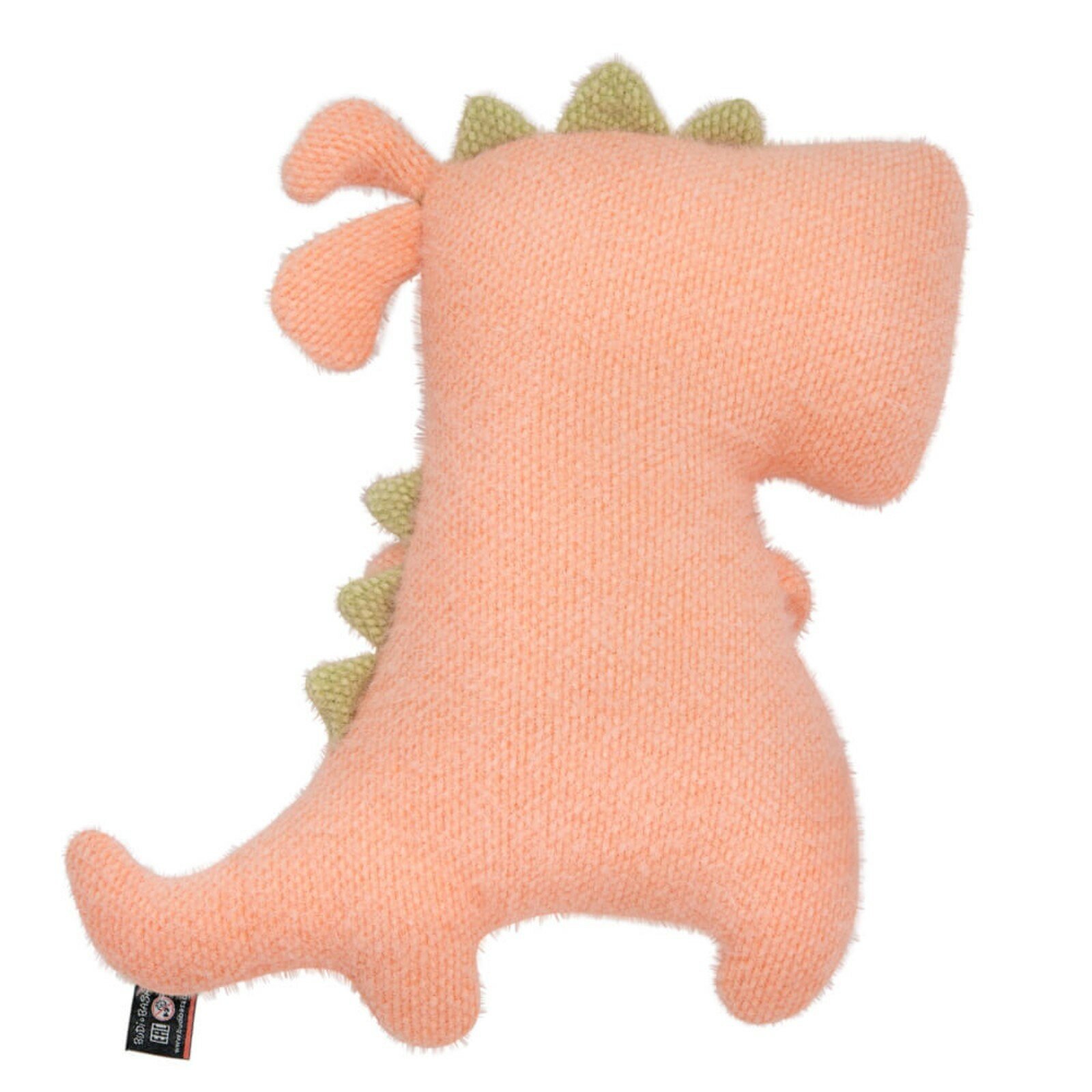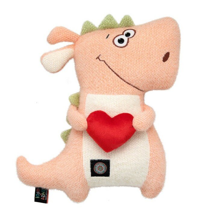Дракон-подушка из короткого меха на трикотажной основе с выработкой лососевого цвета. В лапках у дракона мягкое сердечко из алого софта.