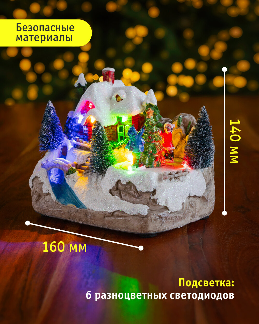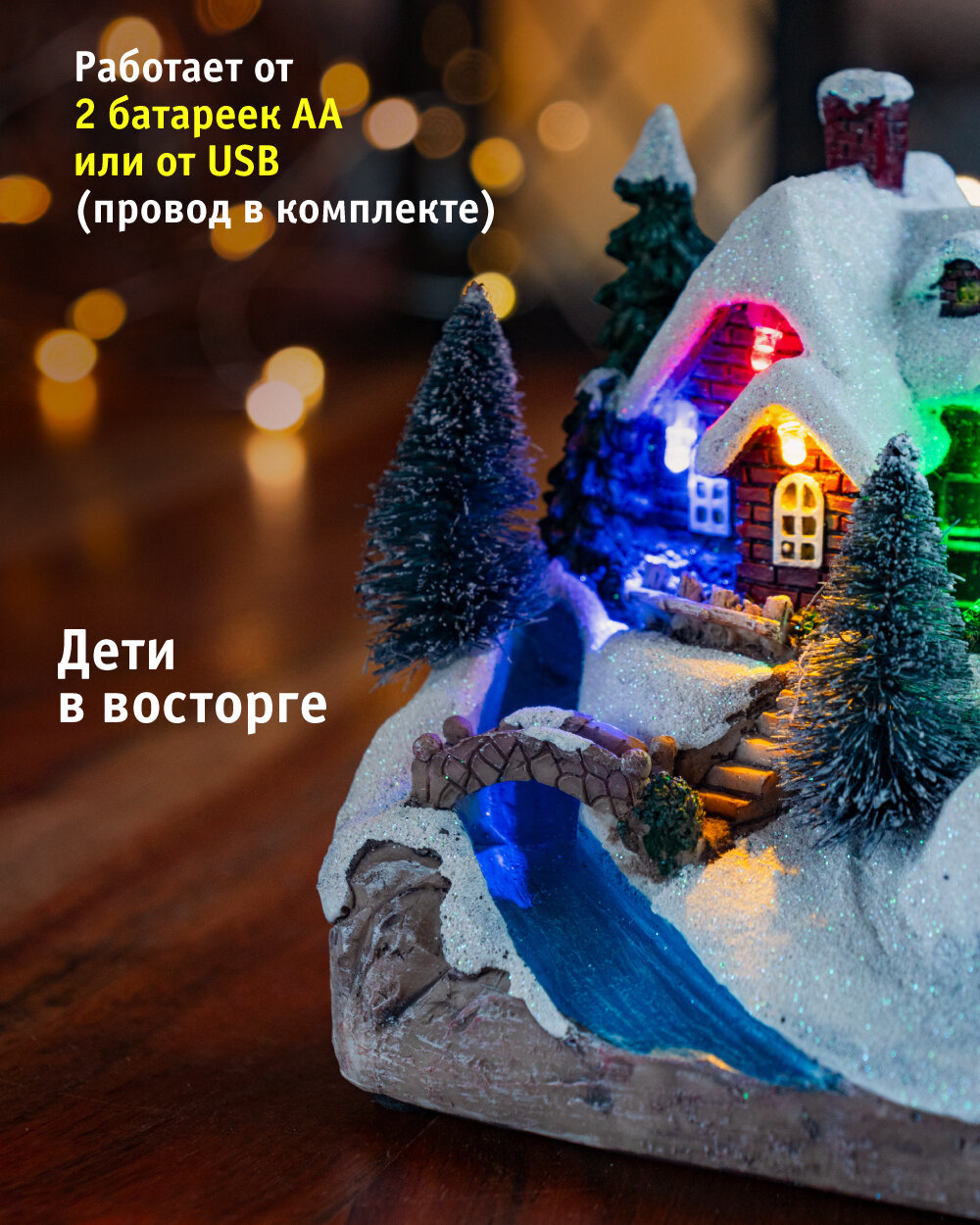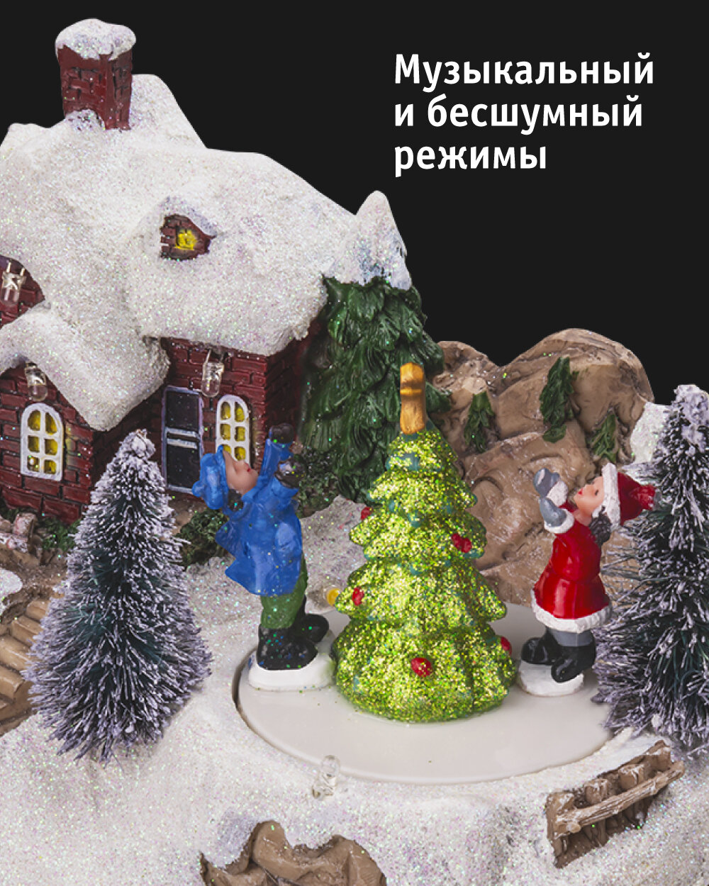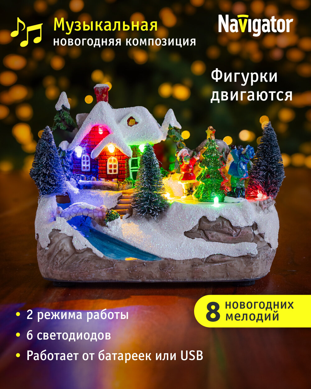 Новогодняя композиция музыкальная с подсветкой и подвижными фигуркамиПраздничные украшения - очень важный атрибут нового года, они создают волшебную атмосферу и поднимают настроение. Новогодняя композиция с музыкой «Хоровод вокруг елочки" будет отлично смотреться под праздничной елкой, на тумбочке, журнальном столике или на подоконнике. При включении новогодняя композиция «оживает»: светятся разноцветные огни, детишки кружатся вокруг елки. Композиция со светодиодной подсветкой может работать с музыкой (8 новогодних мелодий), или бесшумно. Размер новогоднего украшения: 16 х 10,5 х 14 см. Тип питания: 2 батарейки типа АА (Внимание! батарейки в комплект не входят) + USB кабель (провод в комплекте). Новогодний декор — это отличный и нетривиальный подарок на Новый Год или Рождество для мамы, коллеги, подруги, учительницы в школе или воспитательницы в садике. Обнаружив под елкой такой музыкальный светильник, дети будут в восторге!Новогодние украшения Navigator выполнены из безопасных и качественных материалов.