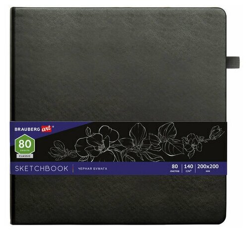 Скетчбук черная бумага 80 листов 200х200 мм 140г/м² резинка Кожзам - BRAUBERG ART черный BRAUBERG (113204) Скетчбук Art Classic чёрная бумага 200х200 мм 80 листов