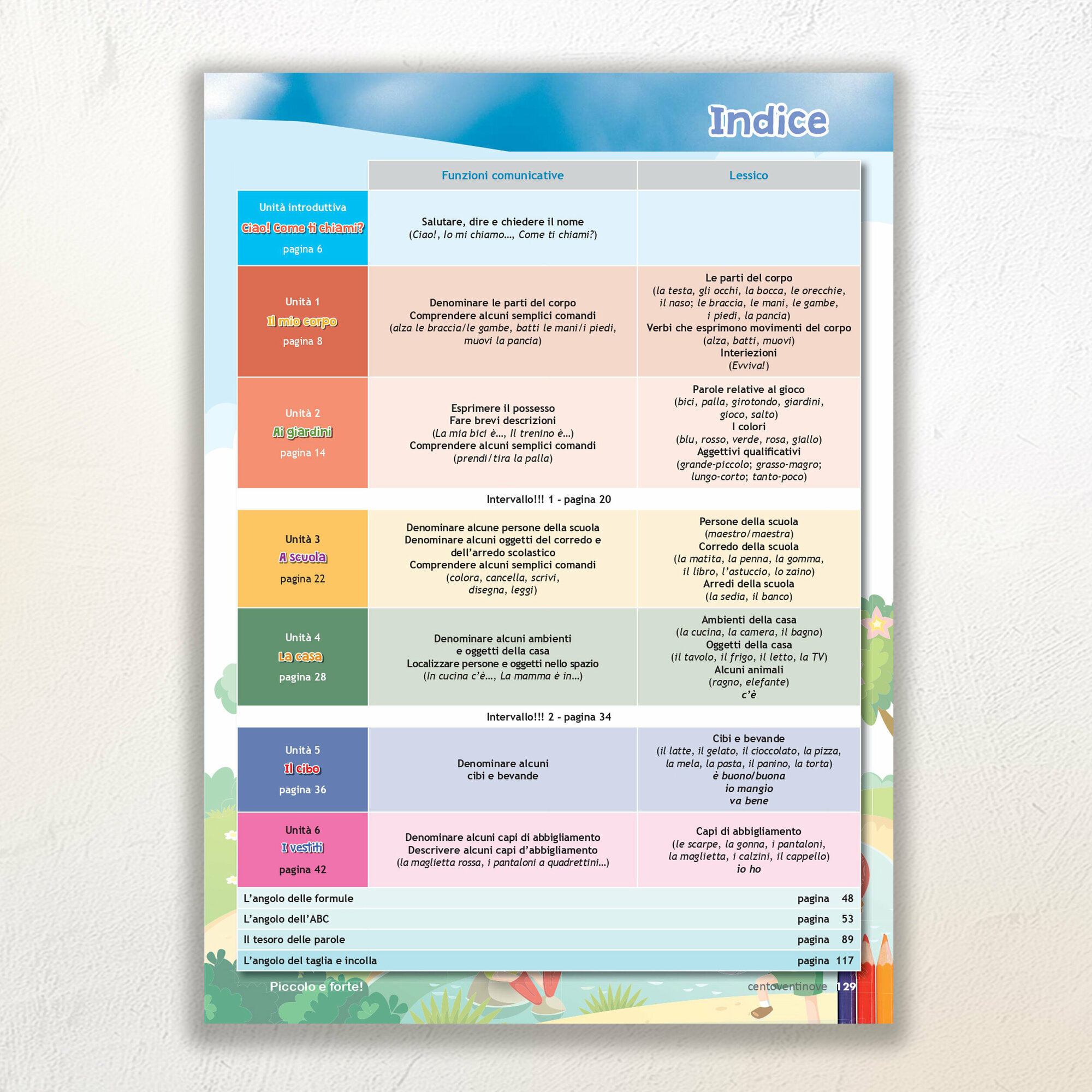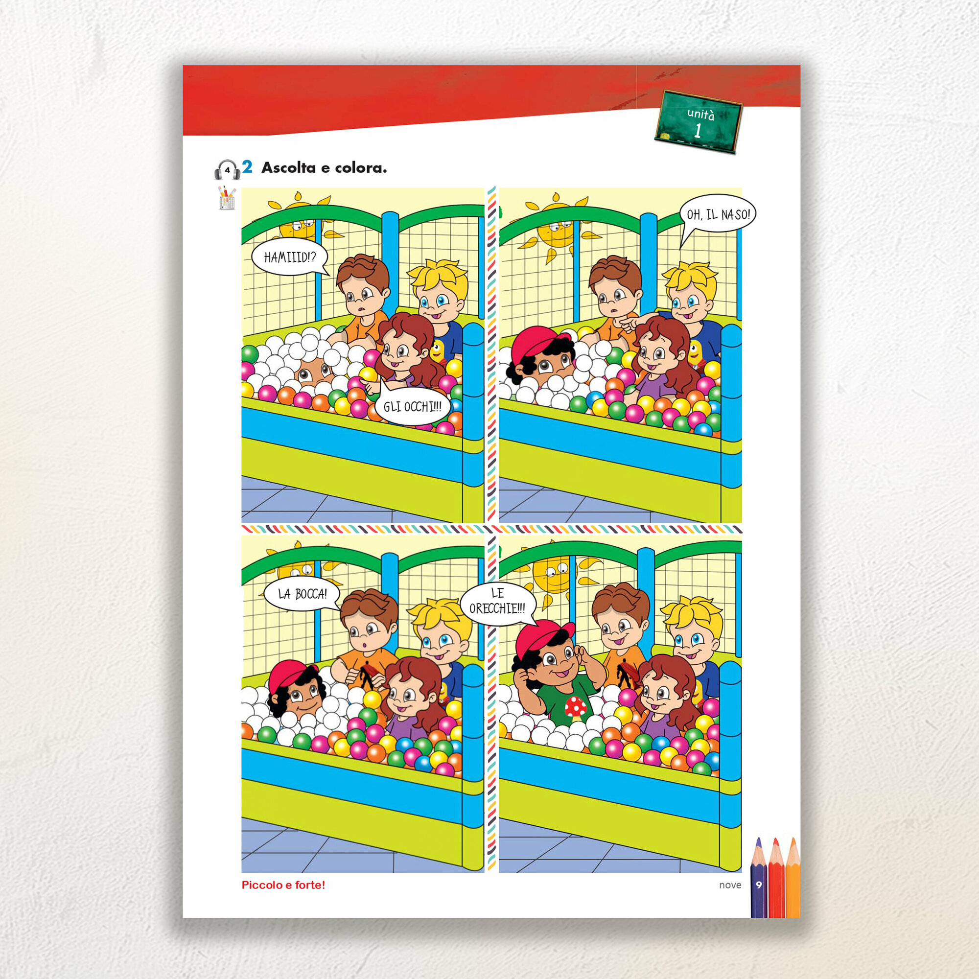 Piccolo e forte! B e indicato per bambini di eta compresa fra i 5 e i 7 anni, che si avvicinano all’apprendimento della lingua italiana anche scritta.