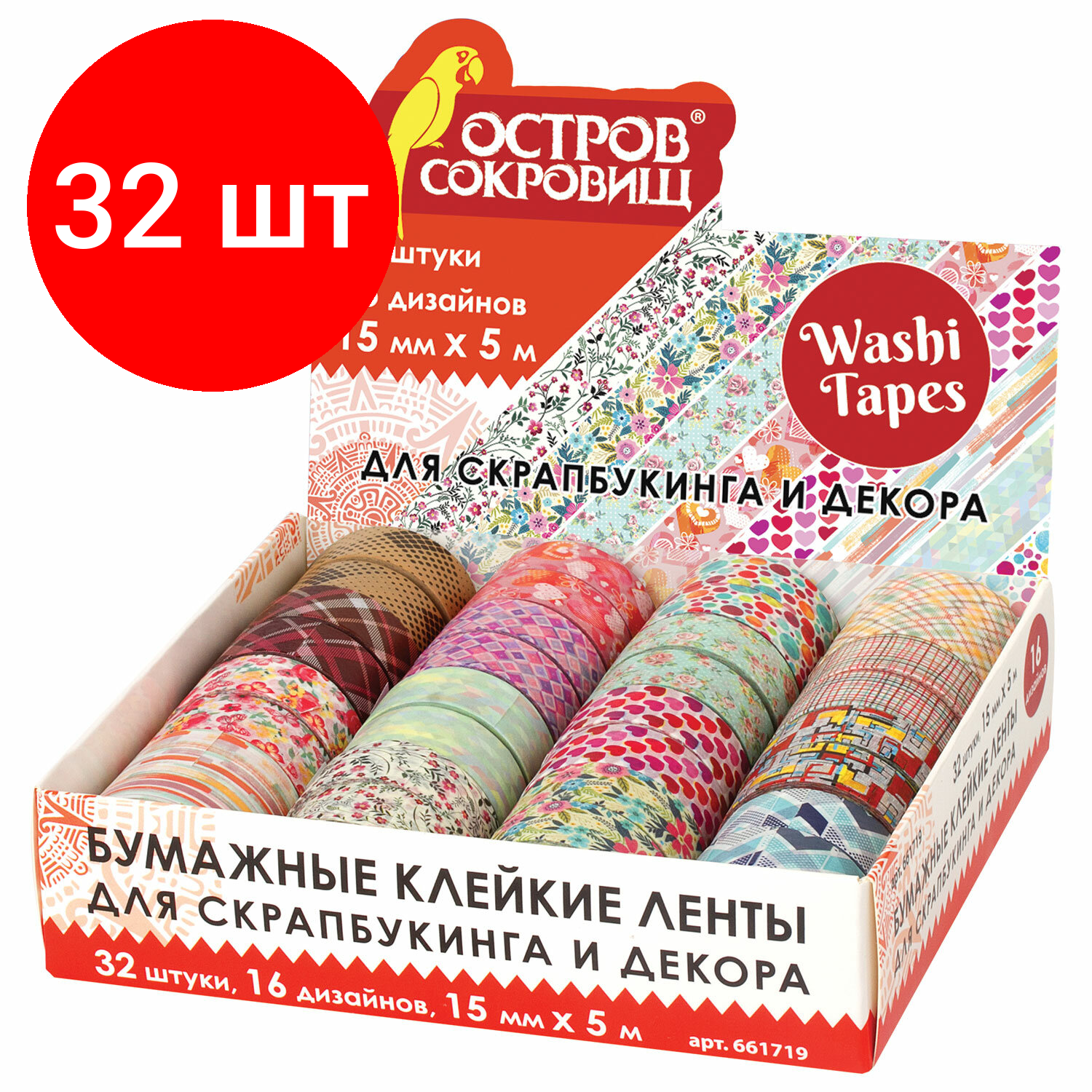 Бумажные клейкие ленты ОСТРОВ СОКРОВИЩ подходят для использования в скрапбукинге, декорирования поделок, открыток, оформления подарков. Декоративные ленты легко приклеиваются и надежно фиксируются на любой поверхности, придавая изделиям оригинальный вид. В дисплее содержится 32 бумажных ленты с 16 различными дизайнами, каждая из которых намотана на пластиковую втулку и промаркирована. Ширина ленты 15 мм позволяет наклеить ее даже на небольшие поделки, а длина 5 м дает большой простор для творчества. Необходимое количество ленты можно легко оторвать рукой или отрезать ножницами, нет необходимости в использовании клея для ее фиксации. На поверхность ленты можно нанести надпись. Бумажные клейкие ленты - это изящный вариант декора фотоальбомов, различных изделий, подарочной упаковки и даже предметов интерьера.