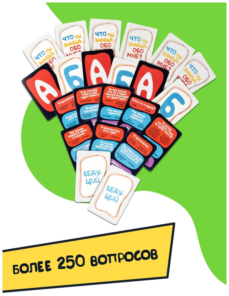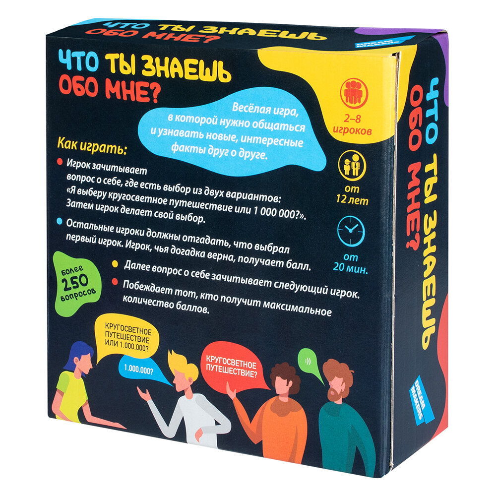 "Что ты знаешь обо мне?" - это весёлая игра, в которой нужно общаться и узнавать новые, интересные факты друг о друге. В игре вы найдёте более 250 весёлых вопросов, которые сделают вашу вечеринку еще ярче. Суть игры проста: ведущий зачитывает вопрос о себе с вариантами ответа, а остальные игроки должны отгадать, что же больше относится к ведущему. Побеждает тот, кто сумеет ответить на большинство вопросов верно.