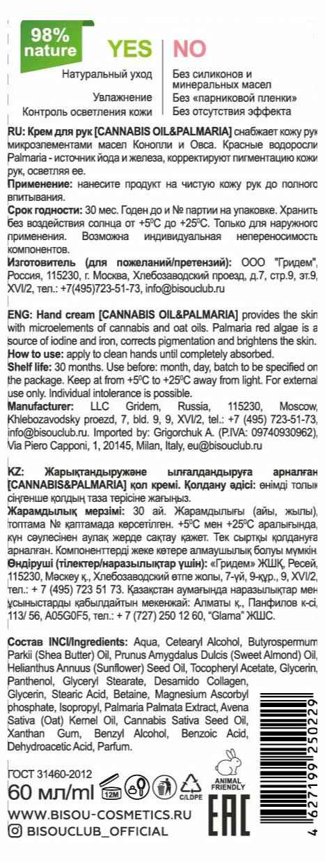 Крем для рук Bisou Cannabis oil & Palmaria осветление и увлажнение 60 мл