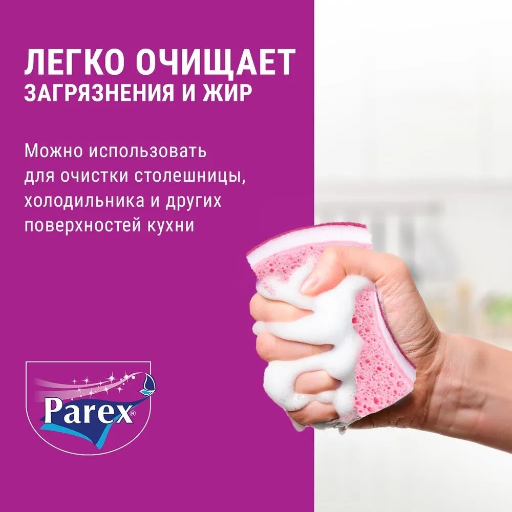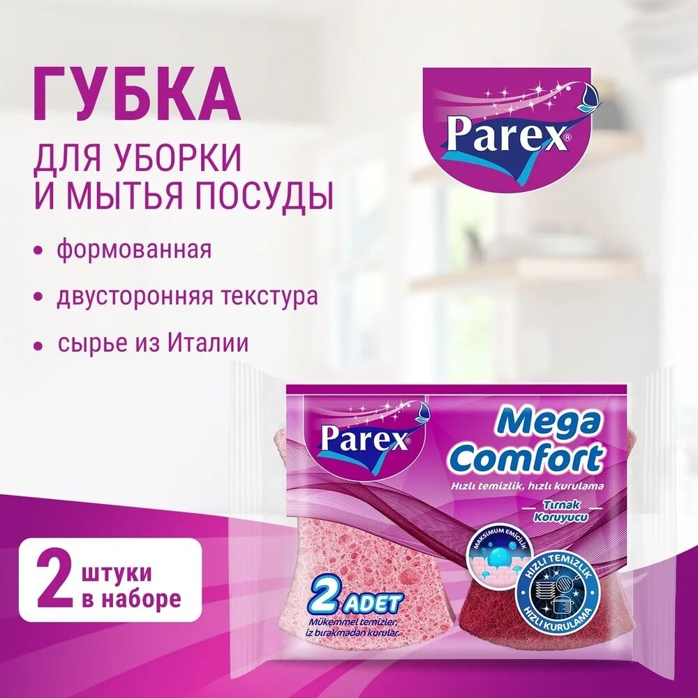 Формованная губка для уборки и мытья посуды PAREX MEGA COMFORT из итальянского сырья легко очищает сложные загрязнения и жир с посуды, обеспечивая превосходный блеск. Можно использовать для очистки столешницы, холодильника и других поверхностей кухни.