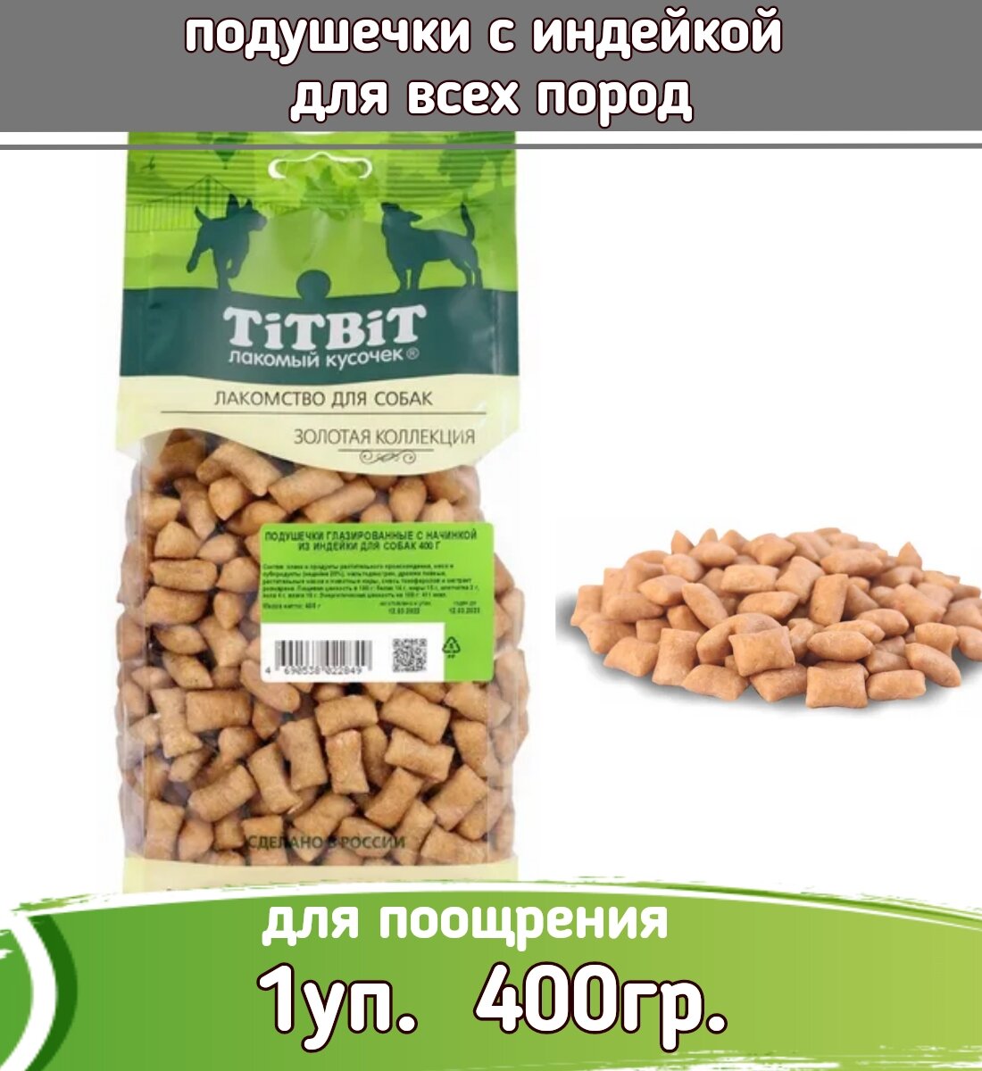 Сервис сравнения цен СкидкаГИД предлагает сравнить цены на товар «TiTBiT Подушечки глазированные с начинкой для собак Золотая коллекция (Индейка 400 г.)»