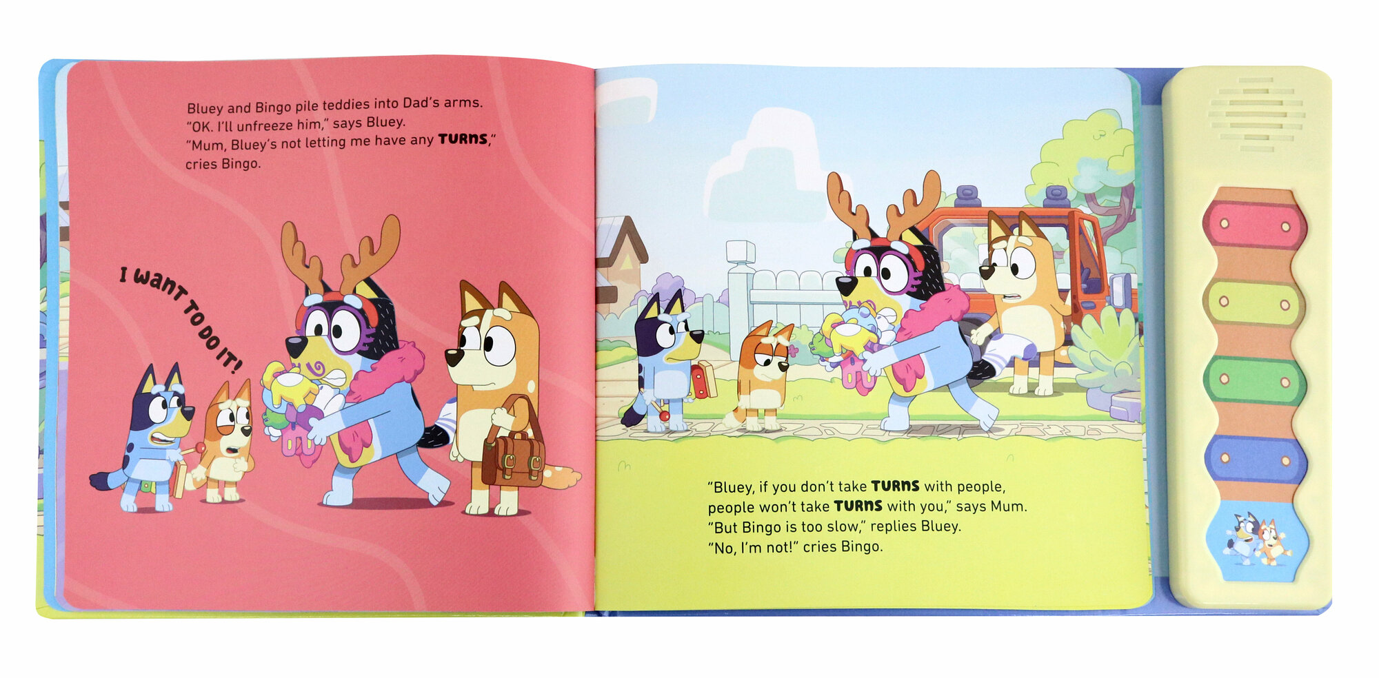 Press the buttons to join in Bluey and Bingo's game of Magic Xylophone in this super fun sound book with 5 different sounds! Do a "Ding!"