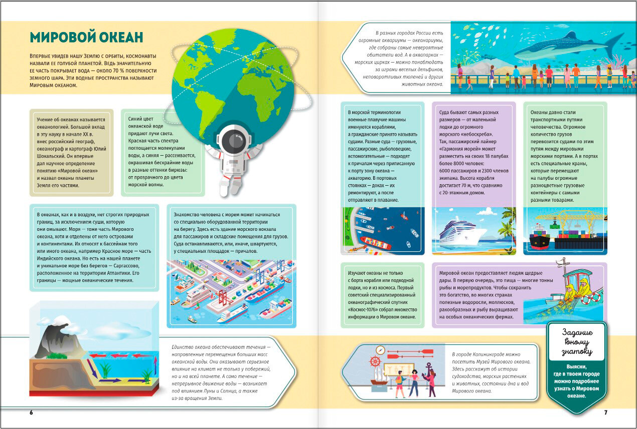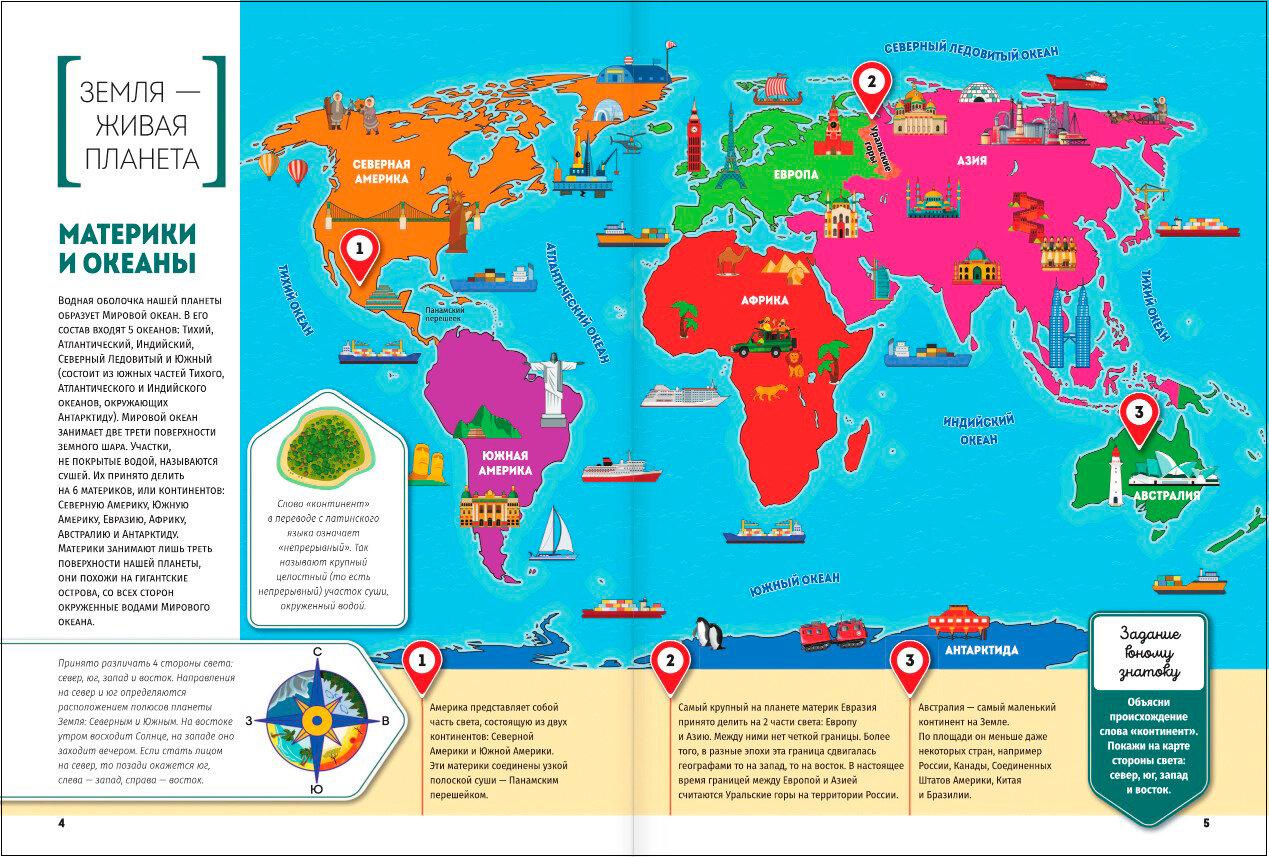 Помимо доступных описаний, прекрасных иллюстраций, познавательных карт и интересных фактов, в книге на каждом развороте имеются самые разные задания для юных знатоков. Ребятам предстоит ответить на вопросы для чего была построена Великая Китайская стена и какая часть Солнца самая горячая, на какие группы делятся все живые организмы планеты, назвать самое большое и самое маленькое государство в мире, рассказать, на какие группы делятся все живые организмы на планете, найти на карте самый большой остров и крупнейшие реки мира, объяснить, почему на полюсах Земли так холодно.